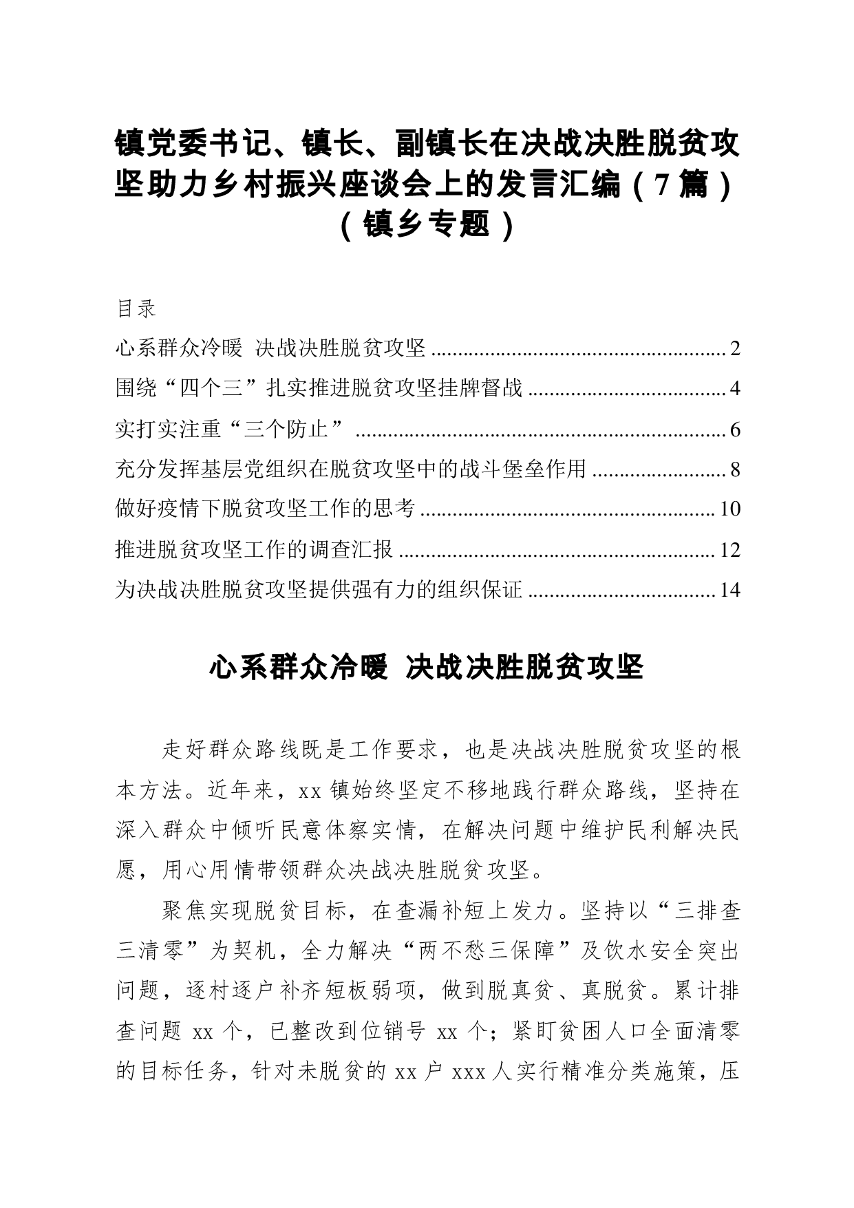 标题:镇党委书记、镇长、副镇长在决战决胜脱贫攻坚助力乡村振兴座谈会上的发言汇编(7篇)(镇乡专题)