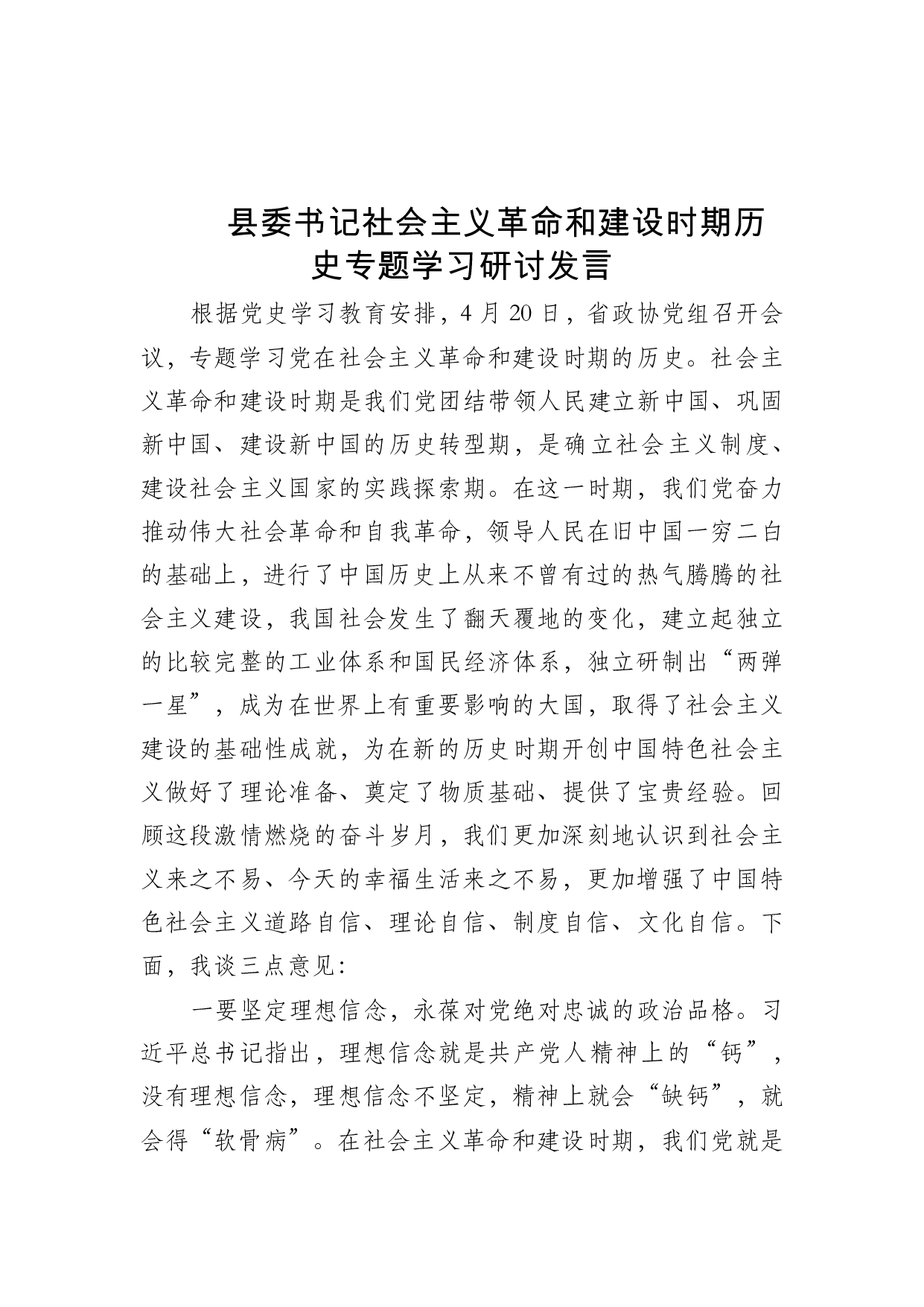 标题:县委书记社会主义革命和建设时期历史专题学习研讨发言