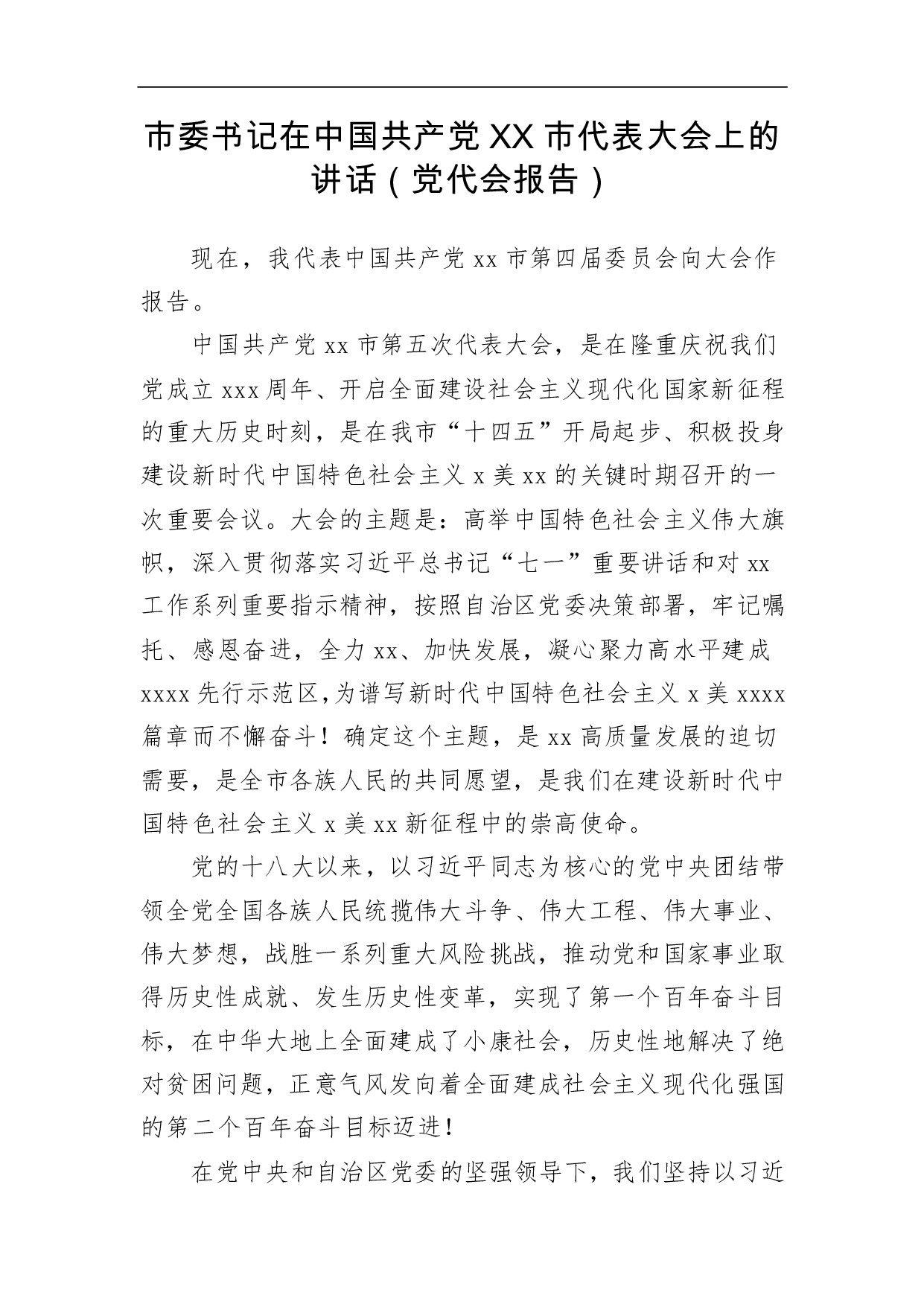 标题:市委书记在中国共产党XX市代表大会上的讲话(党代会报告)