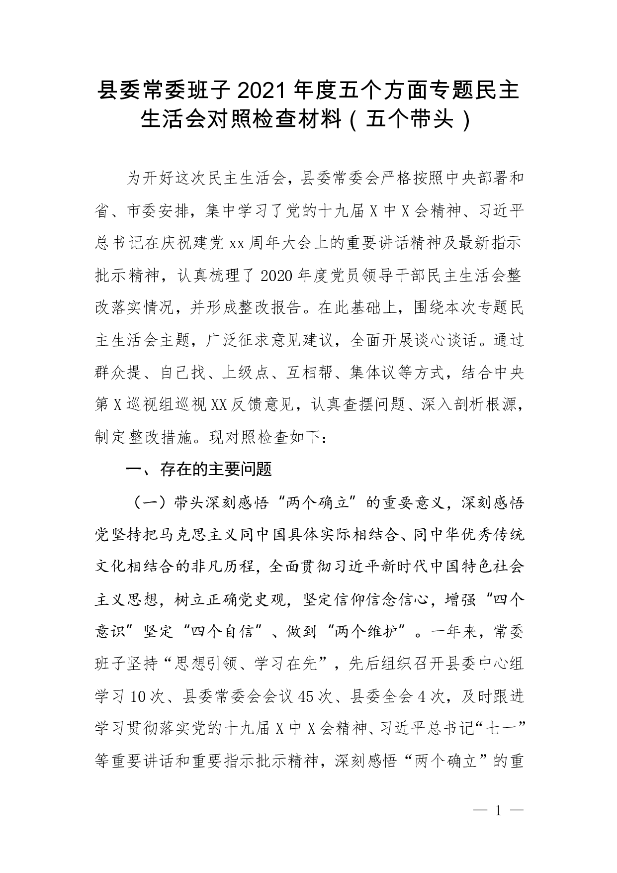 标题:县委常委班子2021年度五个方面专题民主生活会对照检查材料(五个带头)