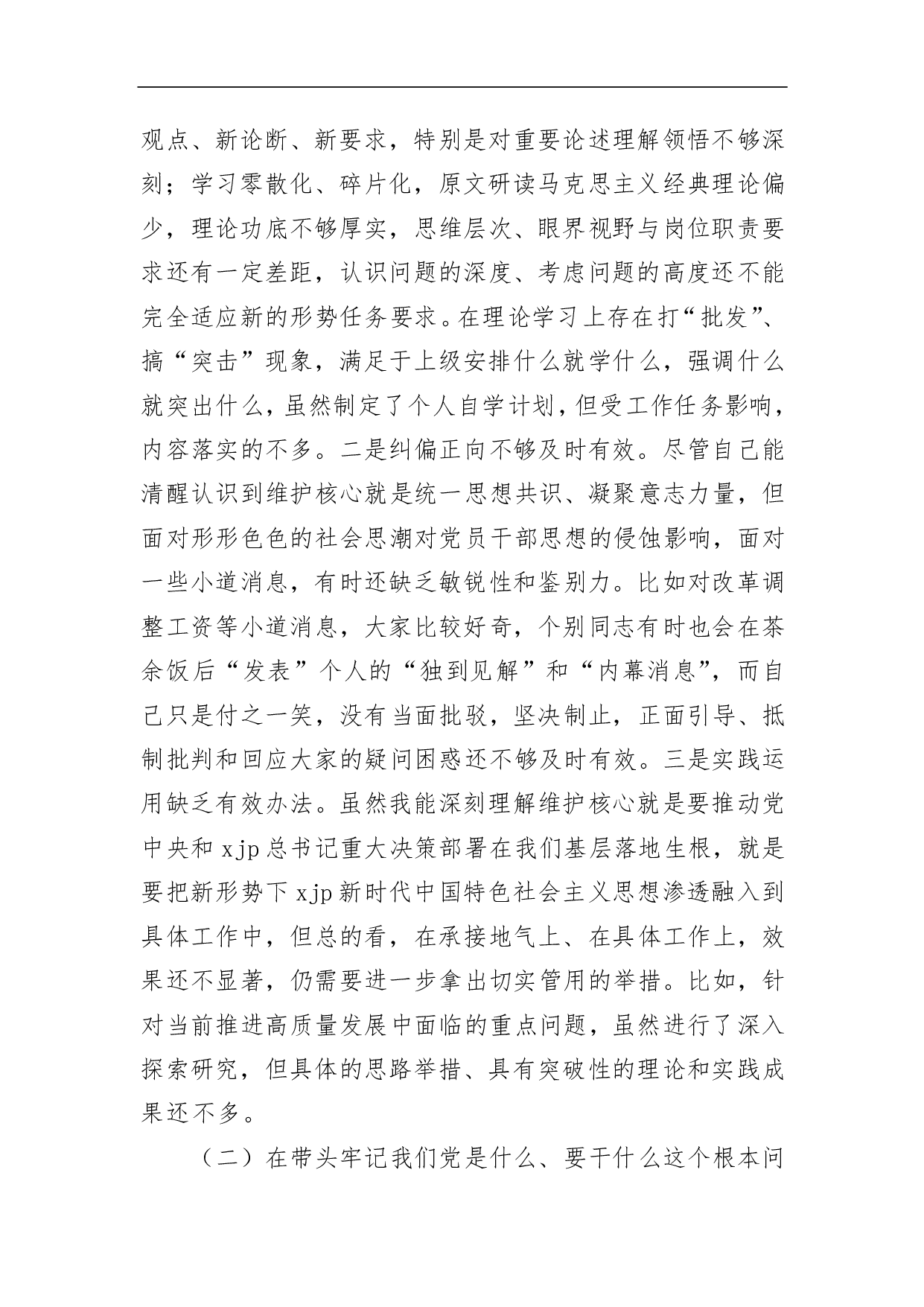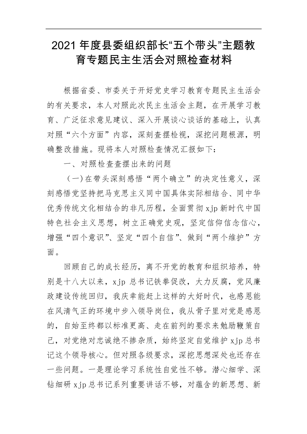 标题:2021年度县委组织部长“五个带头”主题教育专题民主生活会对照检查材料