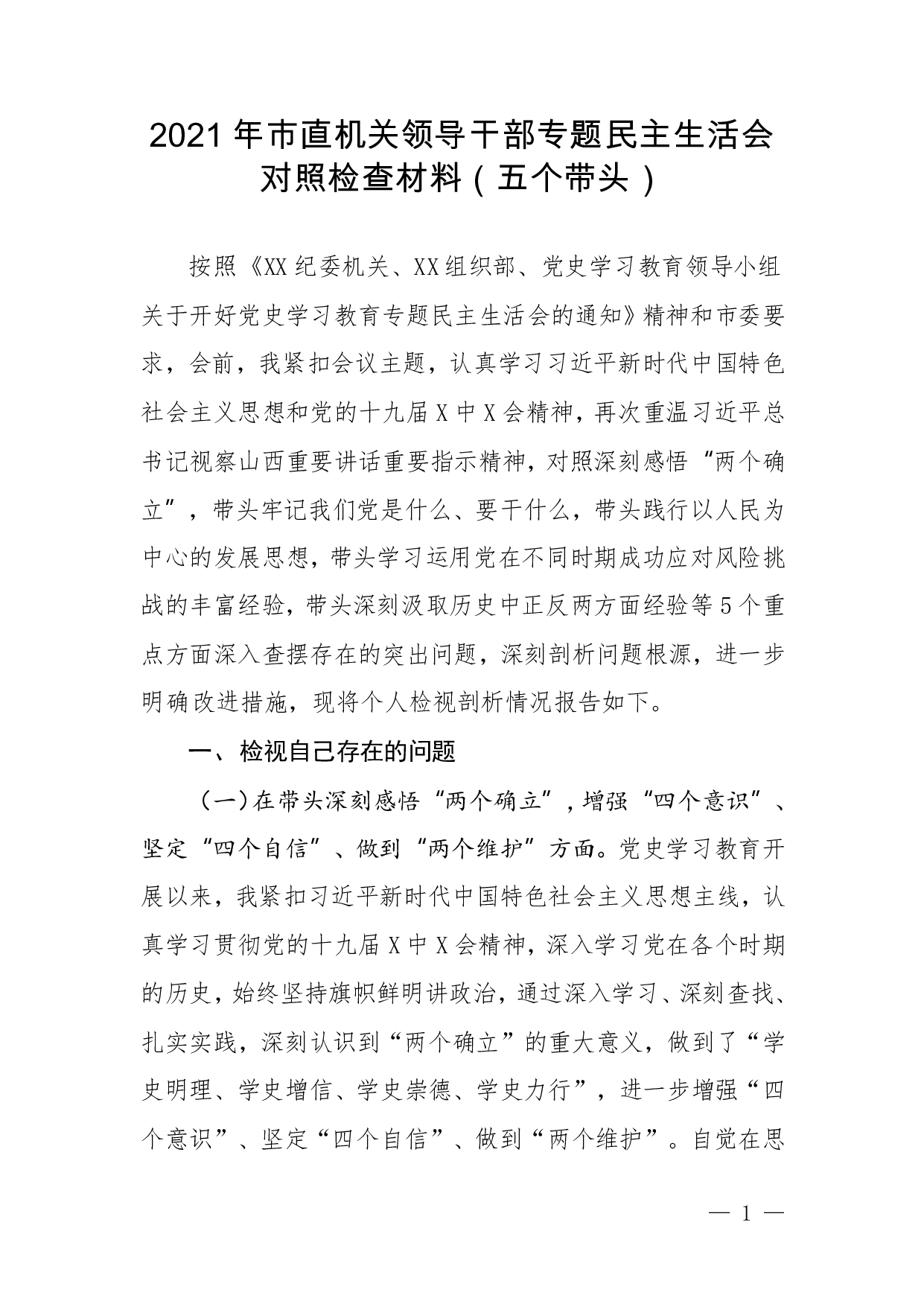 标题:2021年市直机关领导干部专题民主生活会对照检查材料(五个带头)