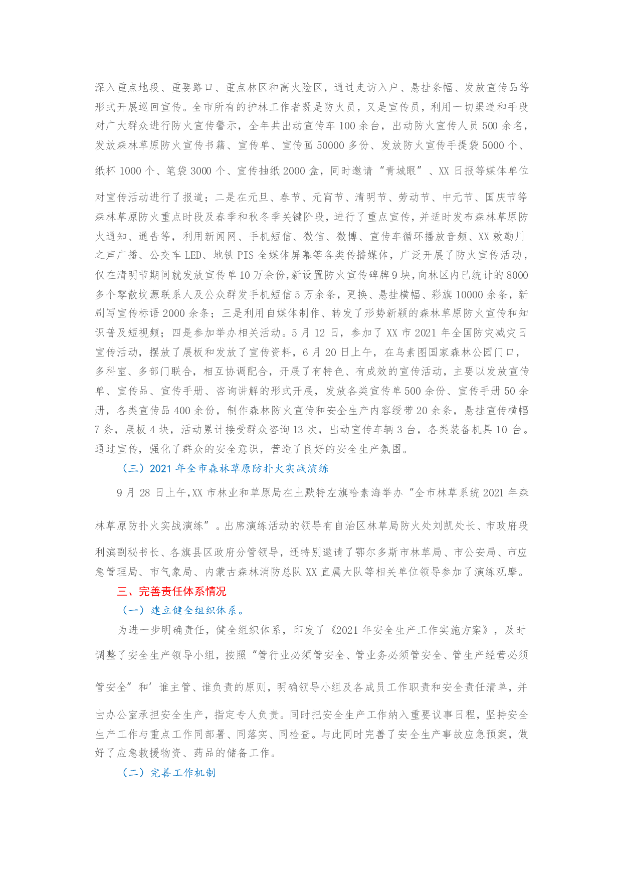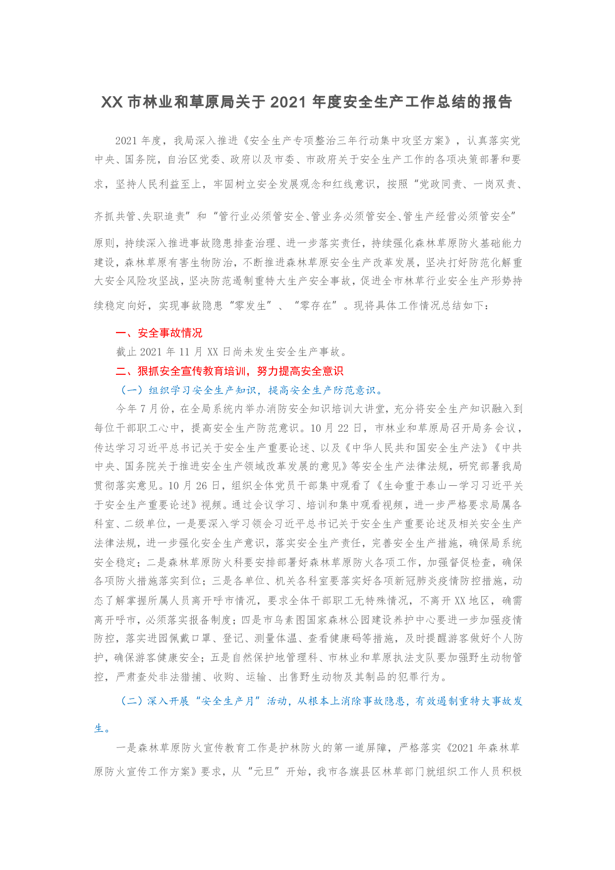 标题:XX市林业和草原局关于2021年度安全生产工作总结的报告