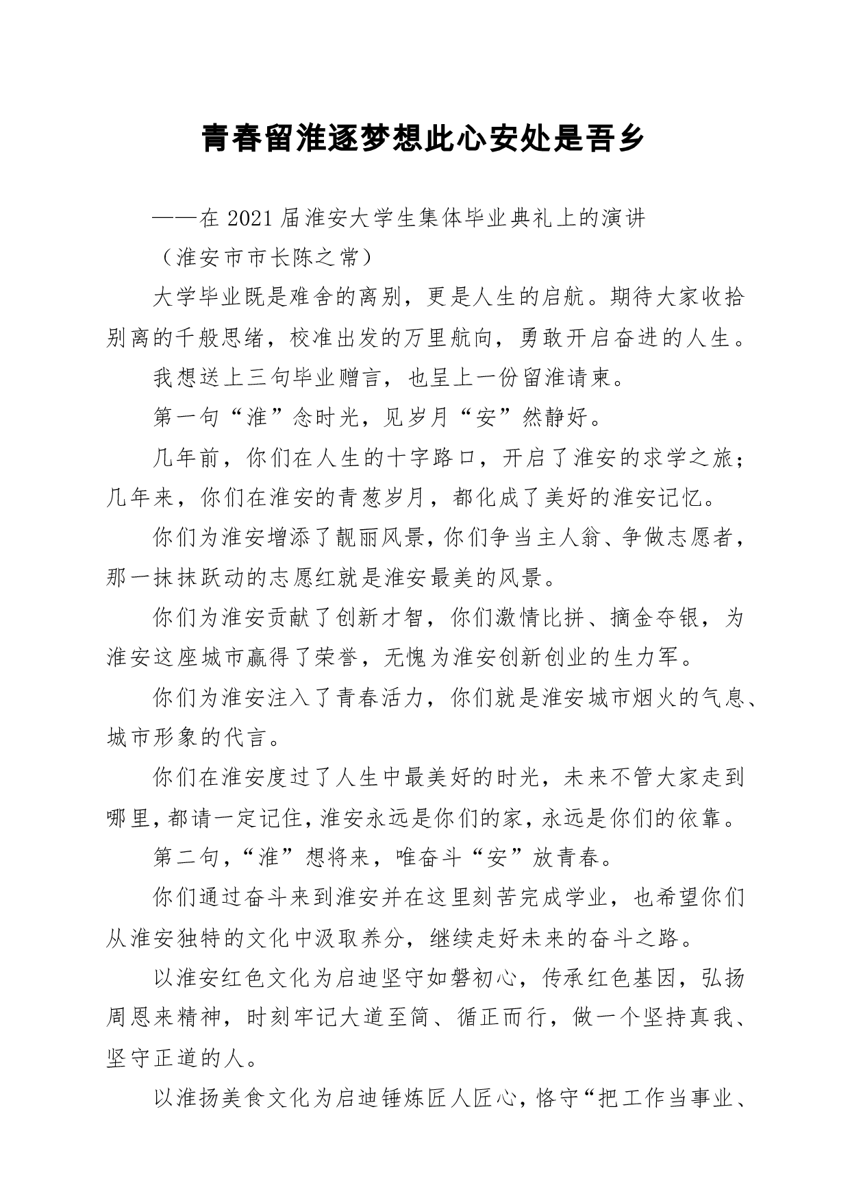 标题:在2021届淮安大学生集体毕业典礼上的演讲