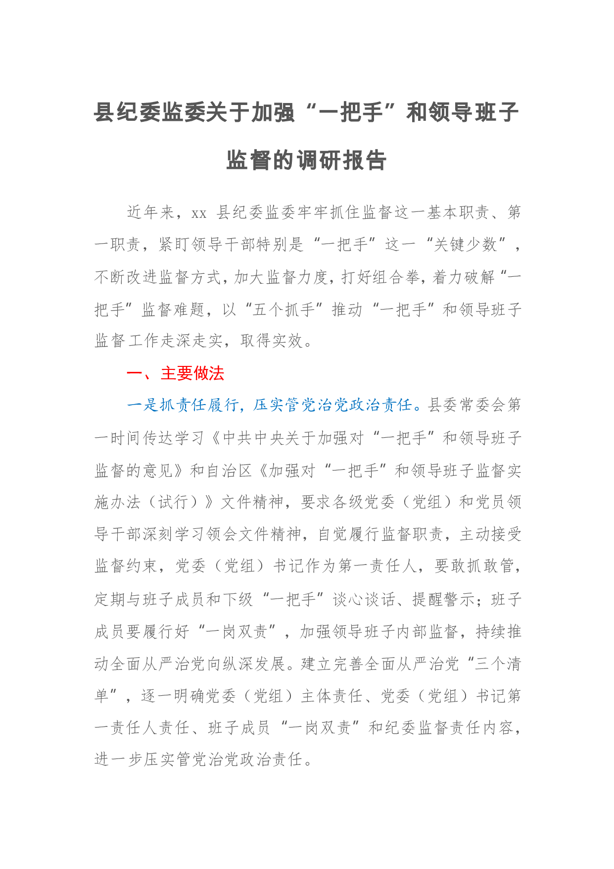 标题:县纪委监委关于加强“一把手”和领导班子监督的调研报告