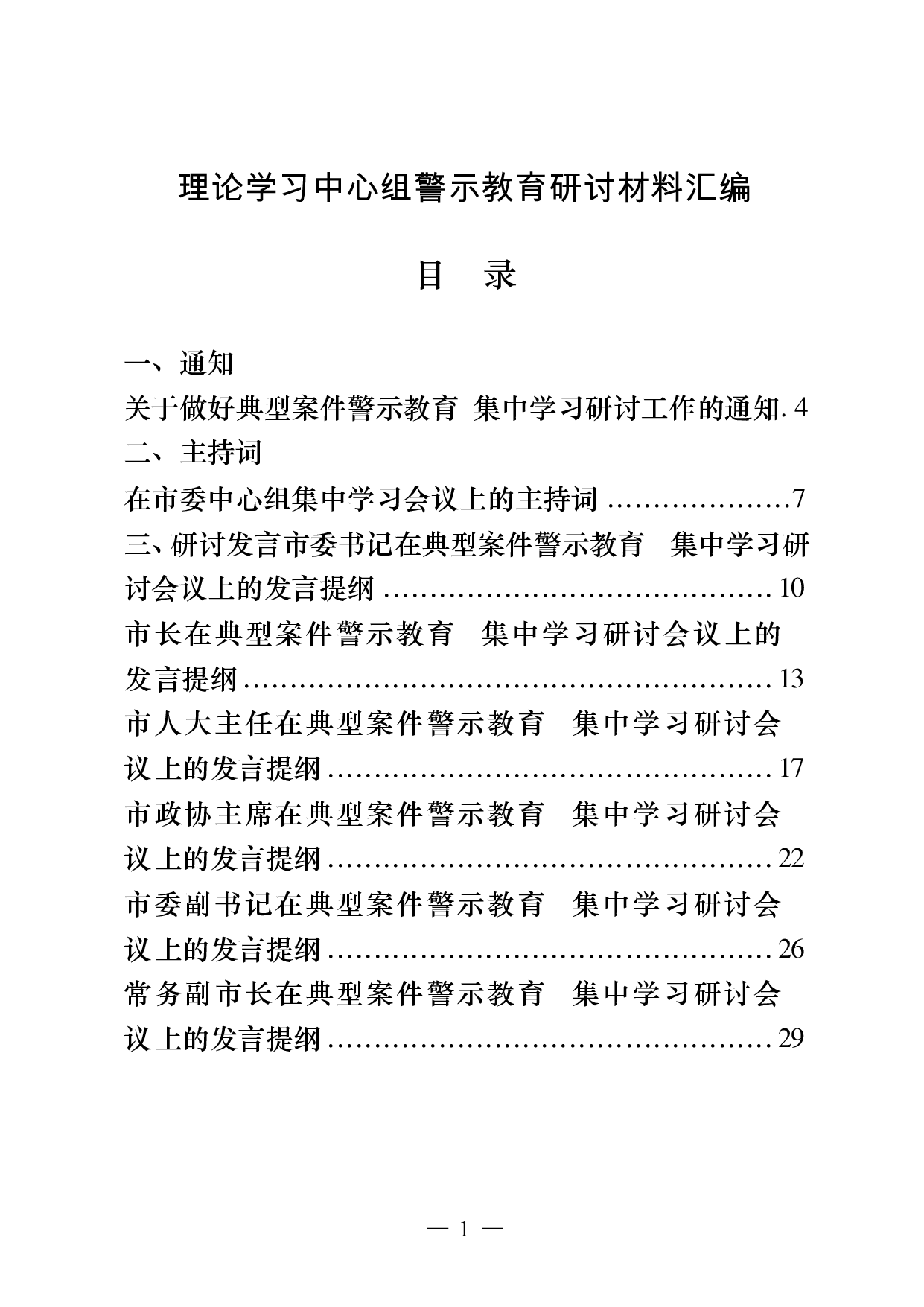 标题:22篇县级市四大班子领导理论学习中心组警示教育研讨通知、主持词、发言等全套资料