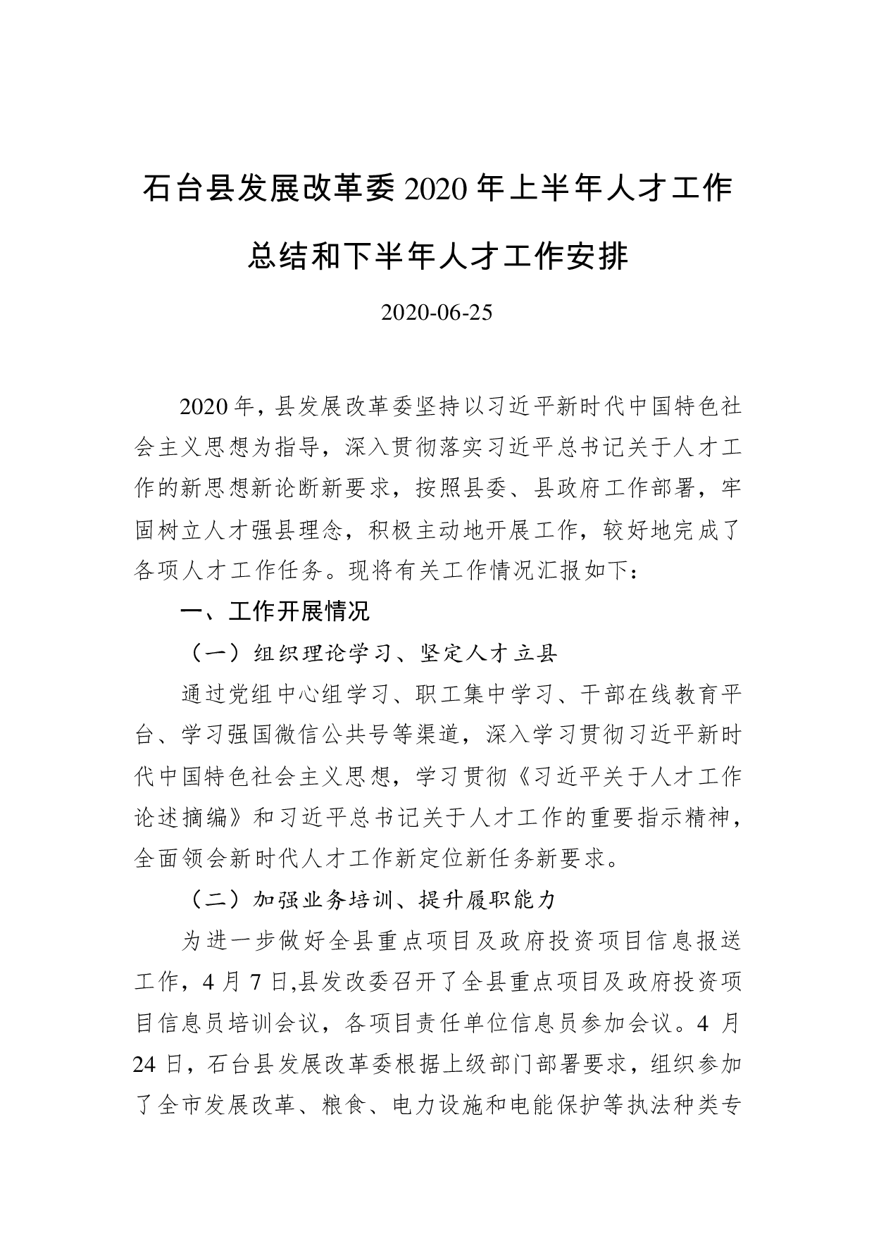标题:石台县发展改革委2020年上半年人才工作总结和下半年人才工作安排