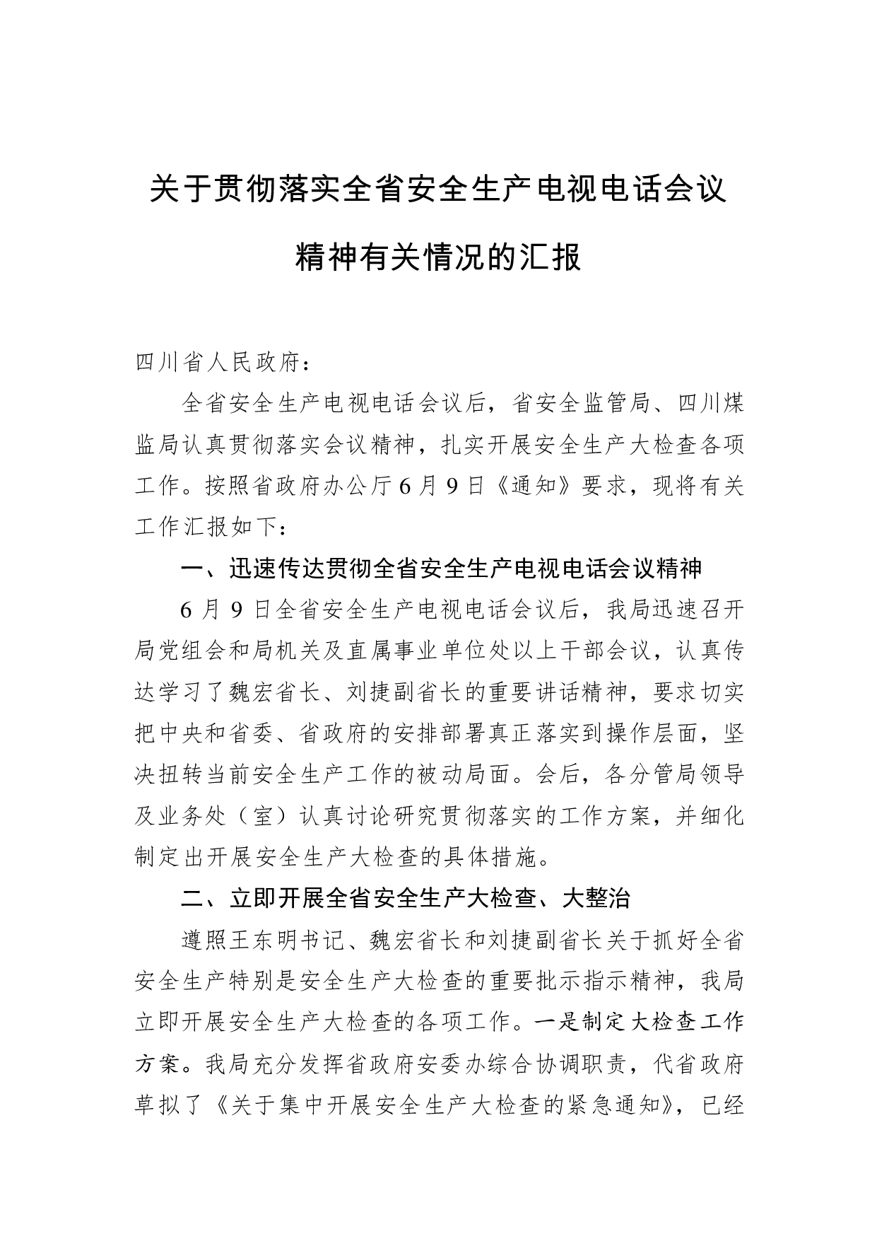 标题:关于贯彻落实全省安全生产电视电话会议精神有关情况的汇报