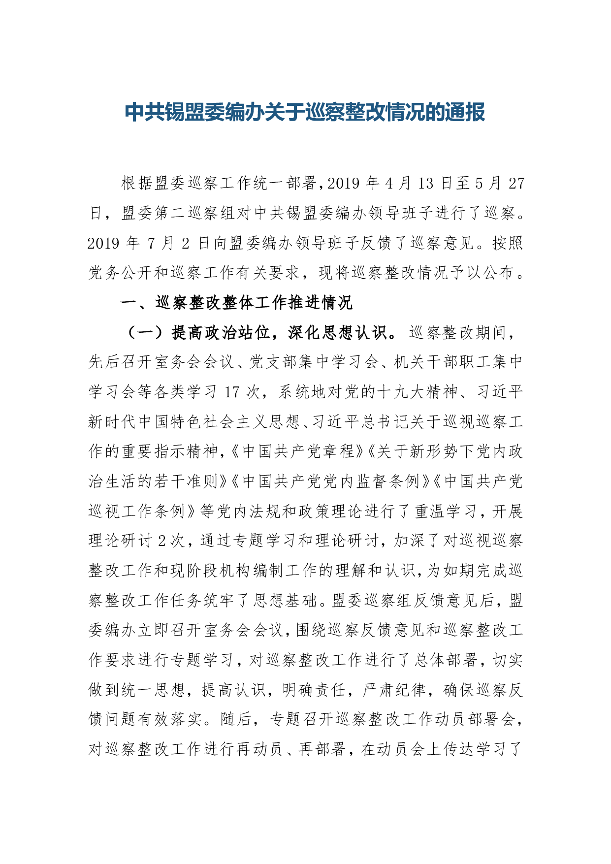 标题:中共锡盟委编办关于巡察整改情况的通报