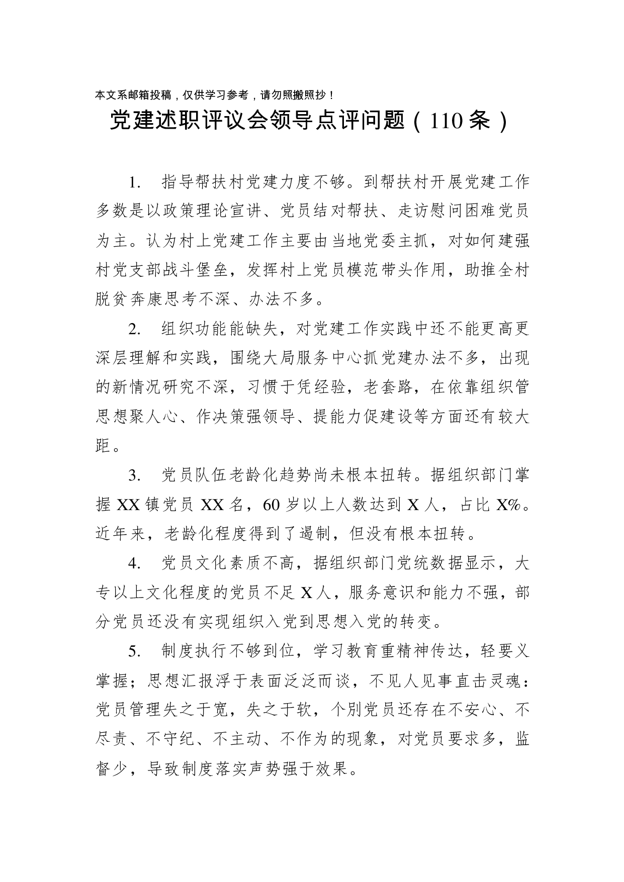 标题:党建述职评议会领导点评问题(110条)