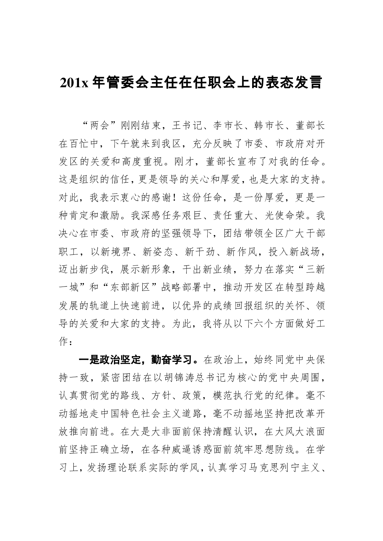 标题:201x年管委会主任在任职会上的表态发言