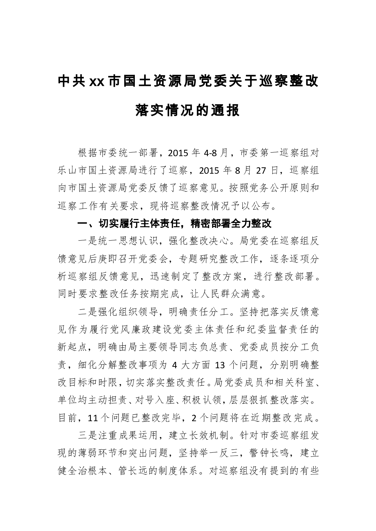 标题:中共xx市国土资源局党委关于巡察整改落实情况的通报