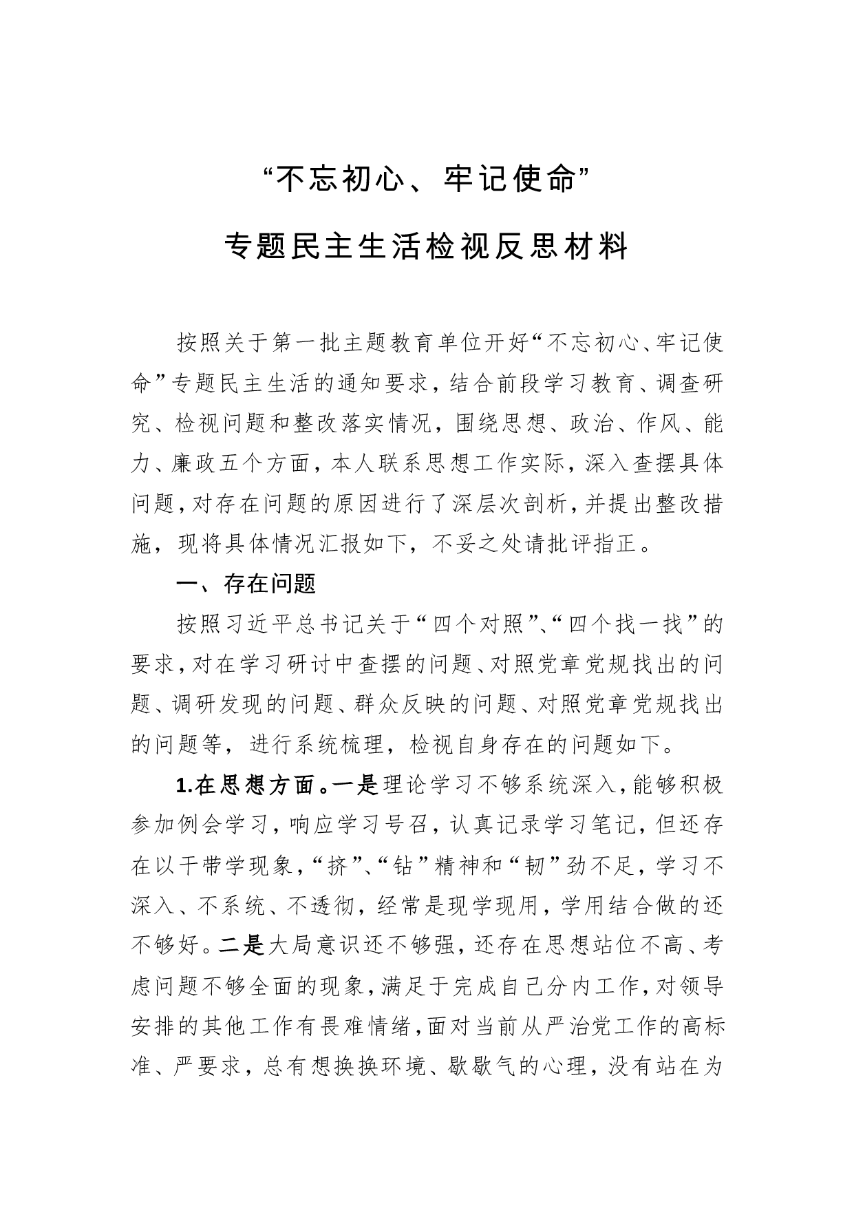 标题:“不忘初心、牢记使命”专题民主生活检视反思材料