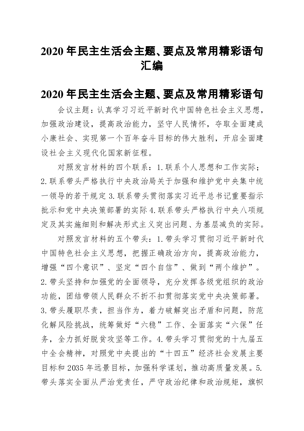 标题:2020年民主生活会主题要点及常用精彩语句汇编