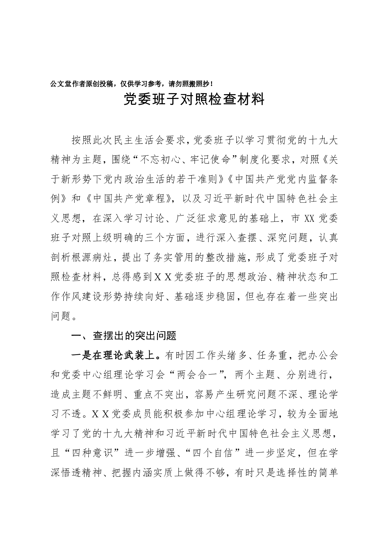 标题:X党委班子对照检查材料