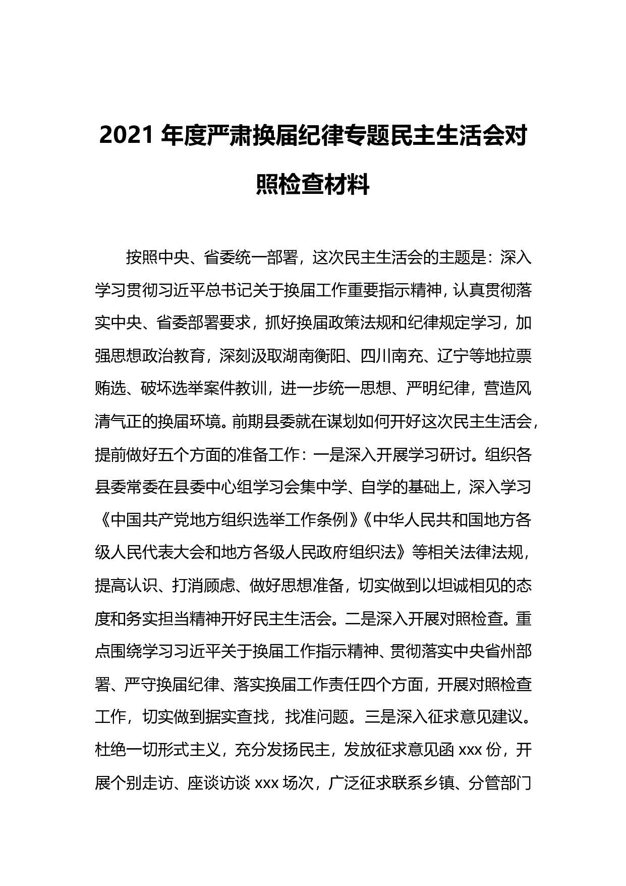 标题:2021年度严肃换届纪律专题民主生活会对照检查材料