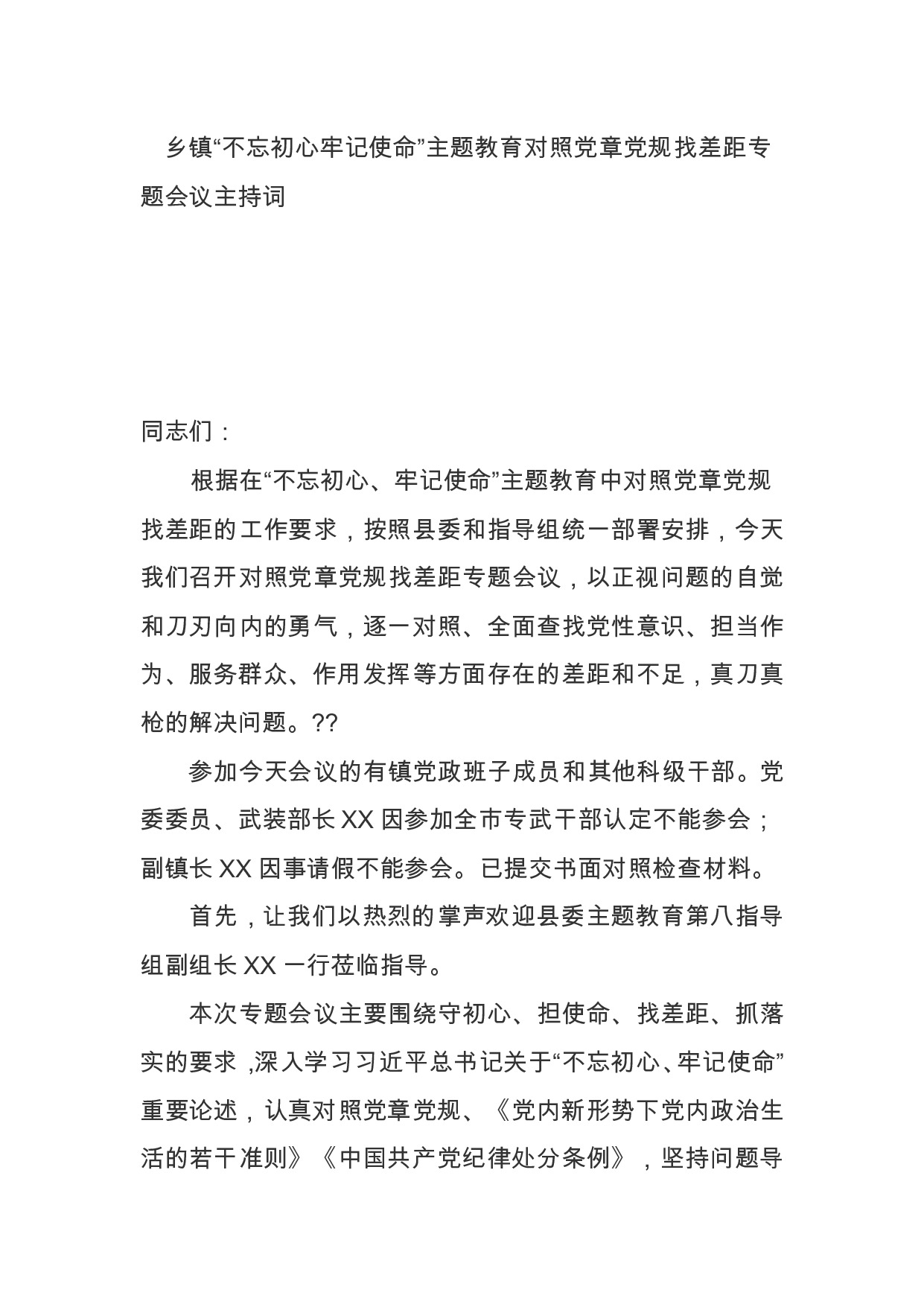 标题:乡镇“不忘初心牢记使命”主题教育对照党章党规找差距专题会议主持词