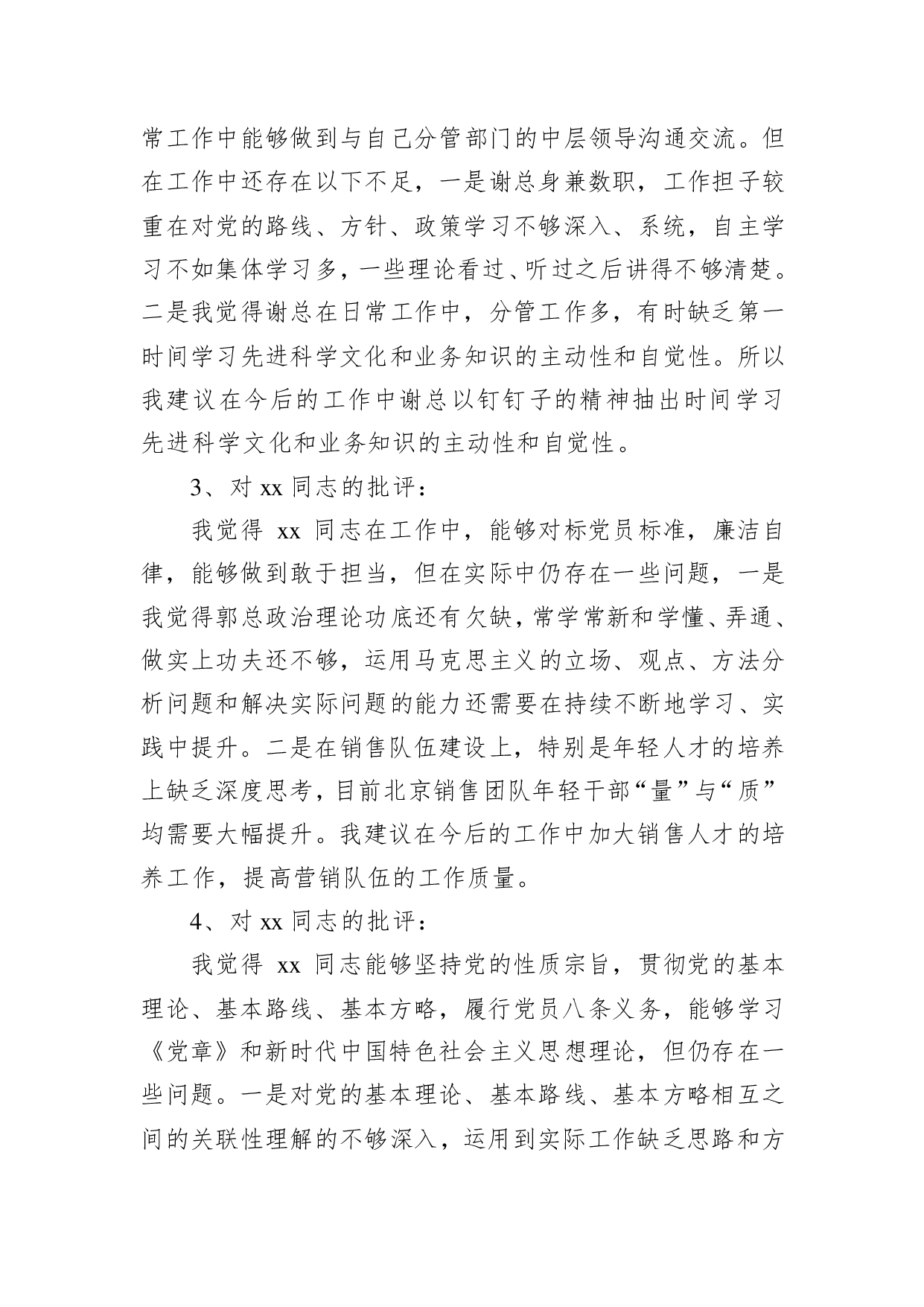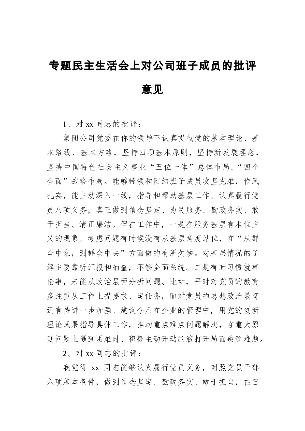 标题:专题民主生活会上对公司班子成员的批评意见