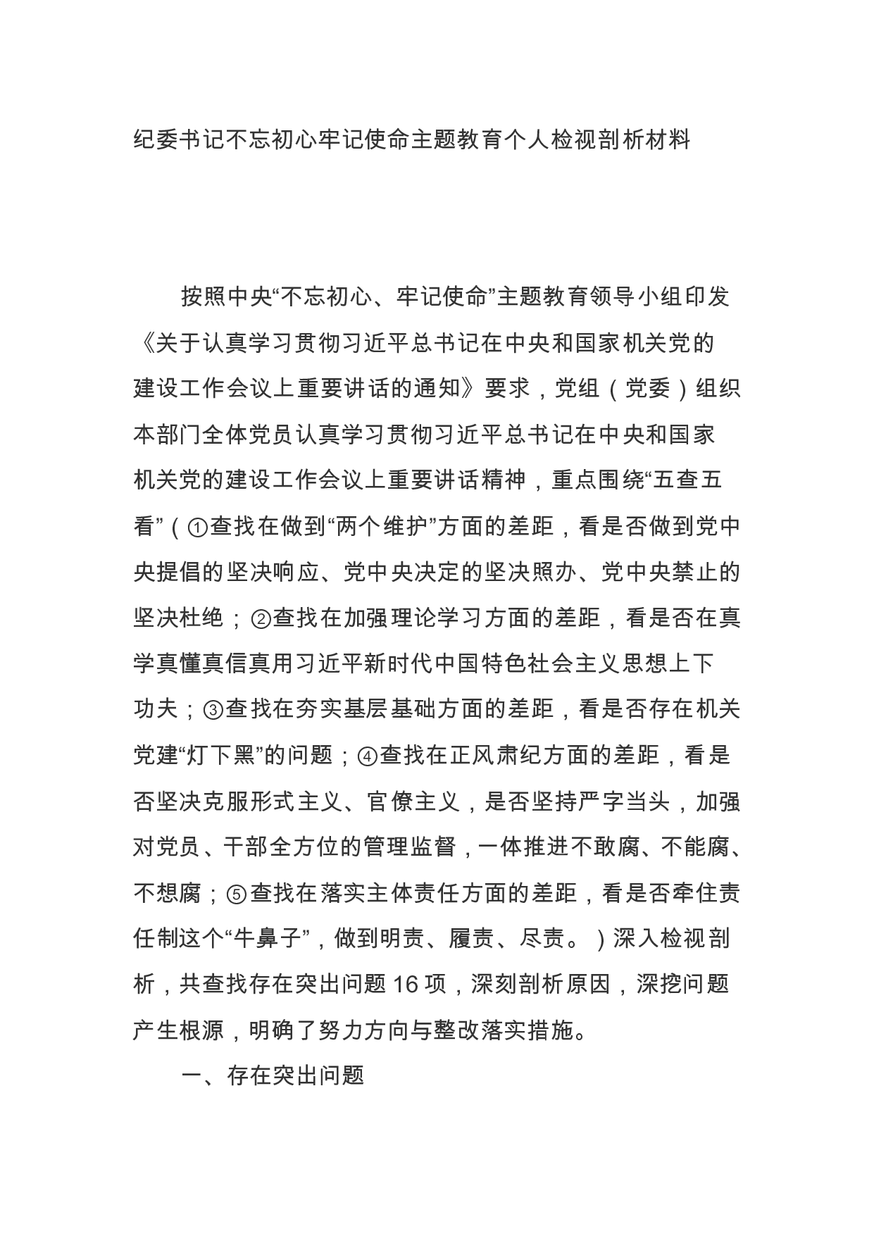 标题:纪委书记不忘初心牢记使命主题教育个人检视剖析材料