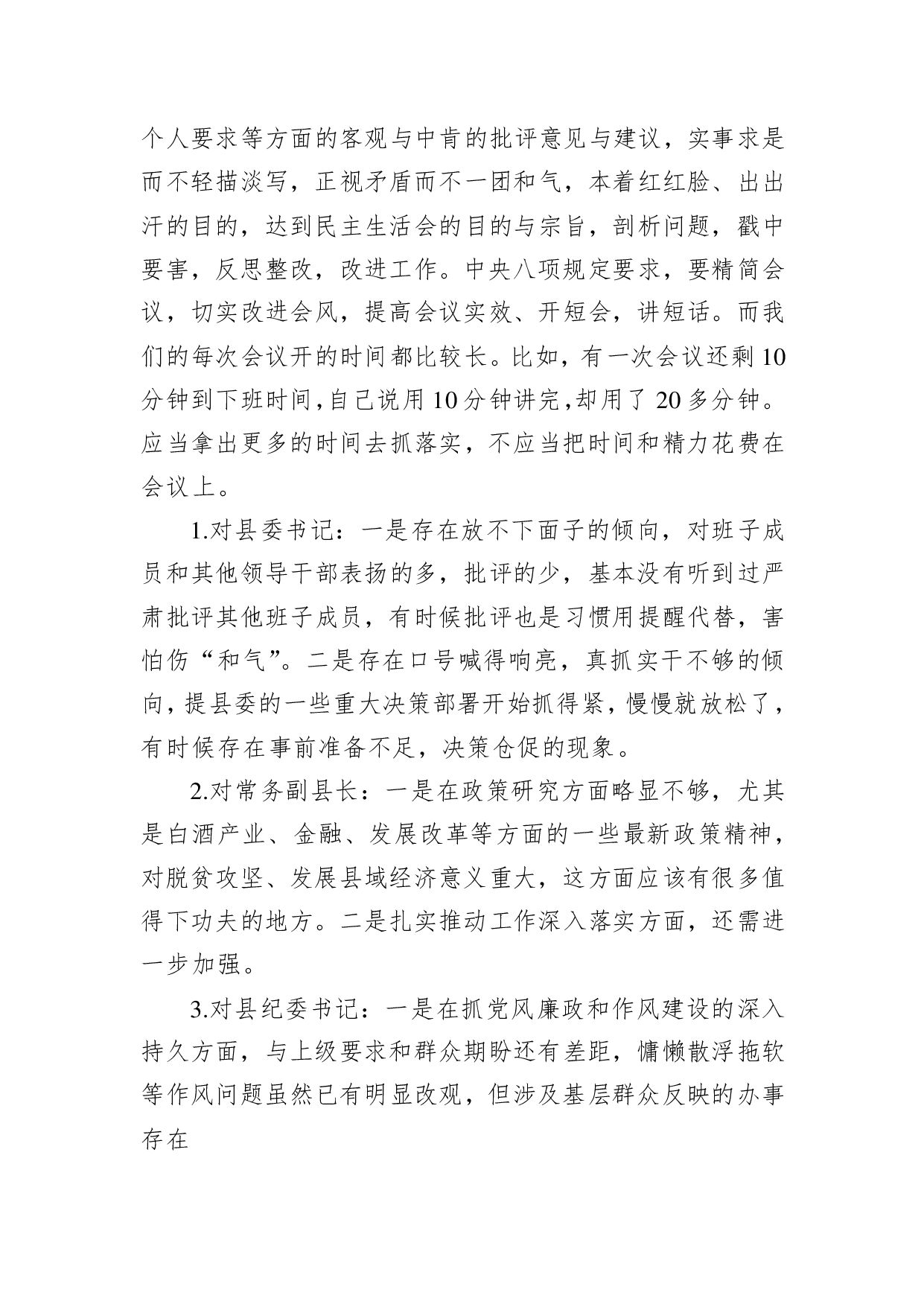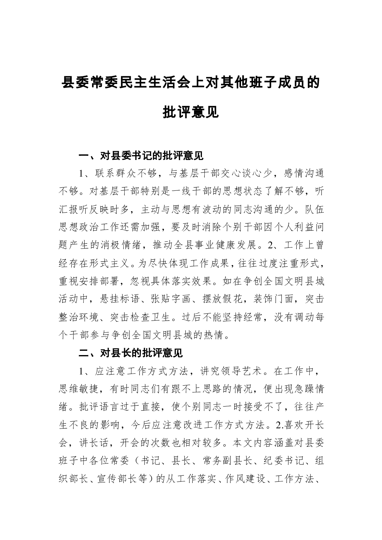 标题:县委常委民主生活会上对其他班子成员的批评意见