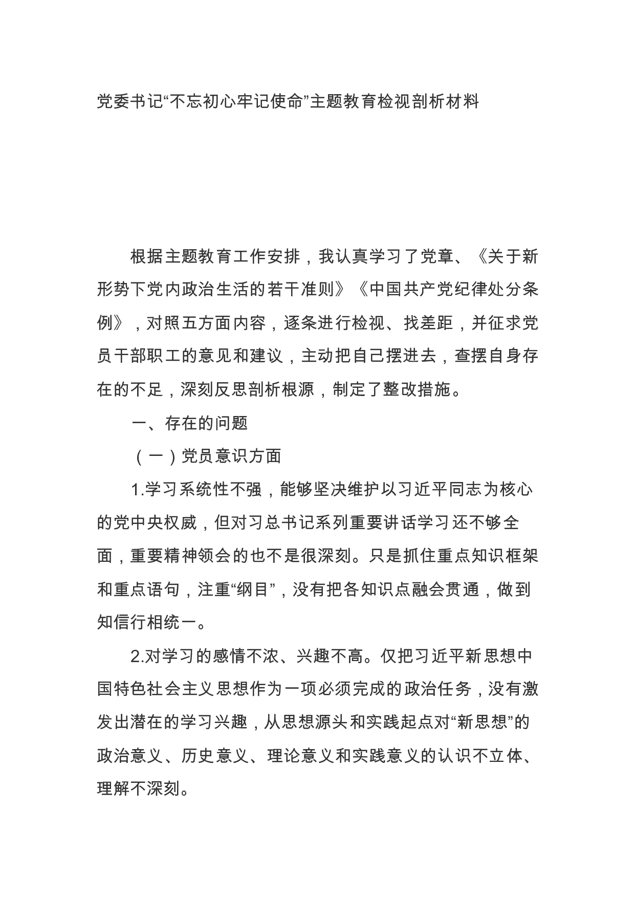 标题:党委书记“不忘初心牢记使命”主题教育检视剖析材料