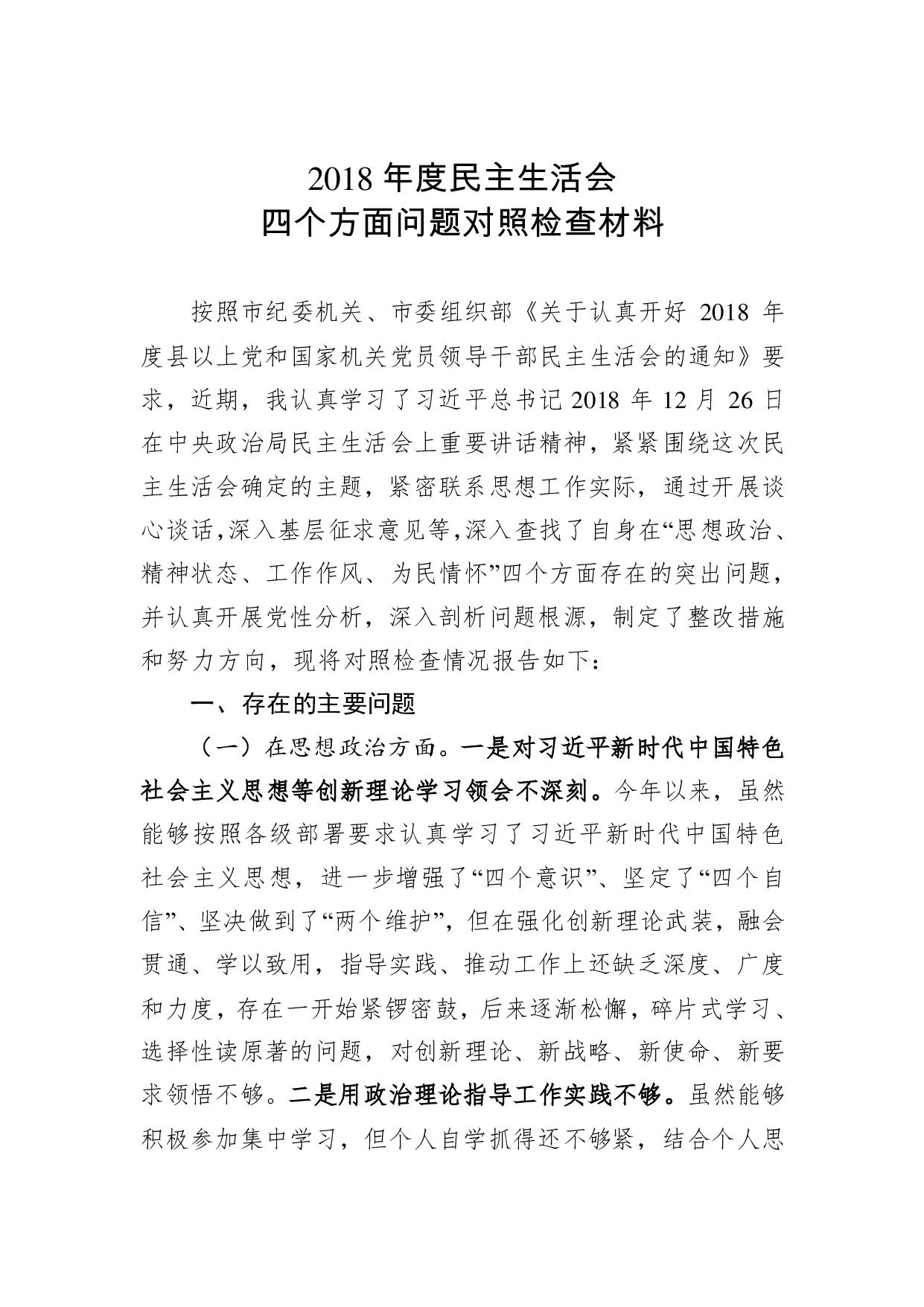 标题:2018年度四个方面问题对照检查材料