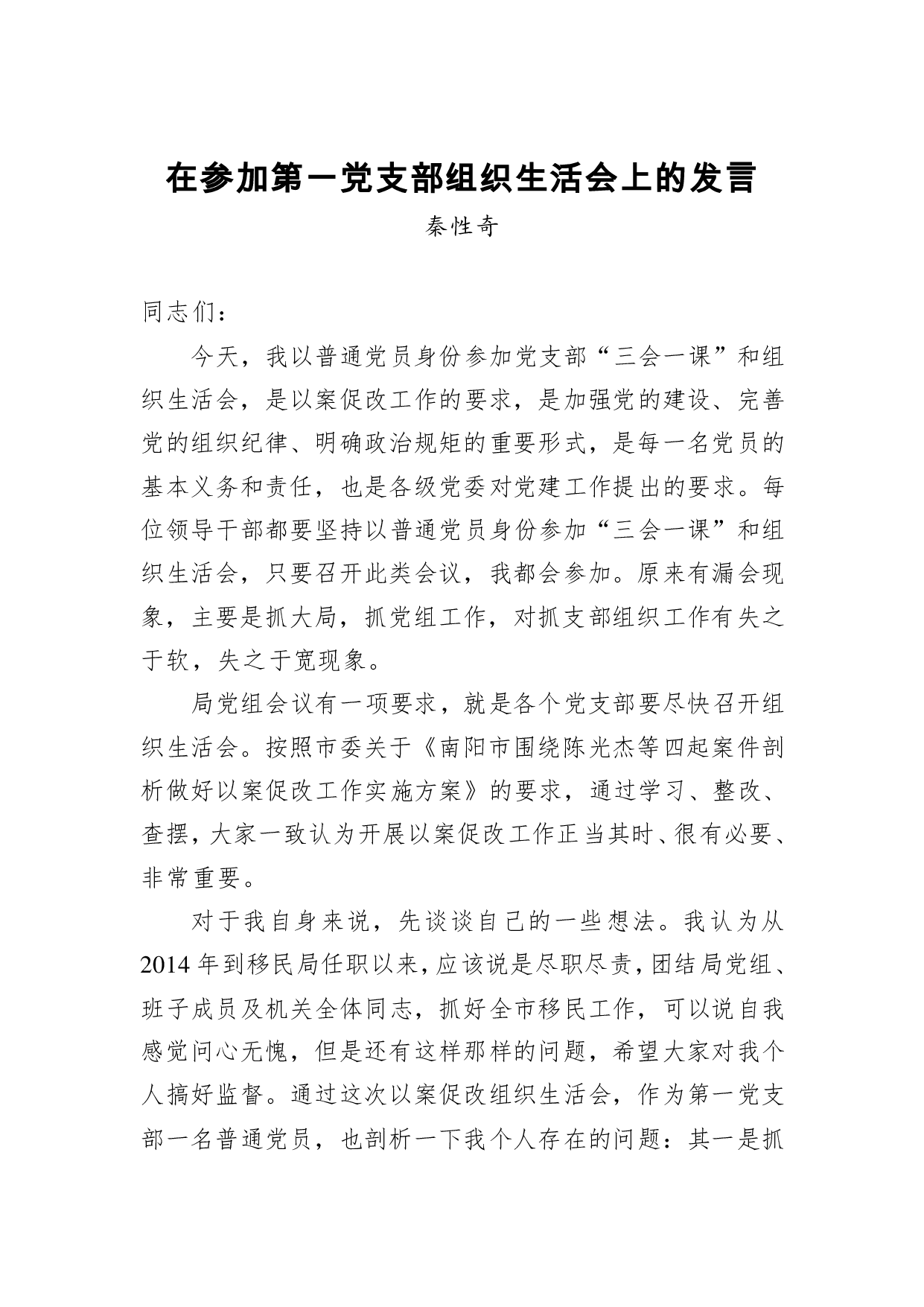 标题:秦性奇:在参加第一党支部组织生活会上的发言