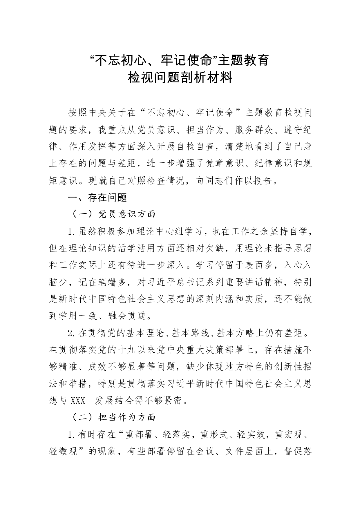 标题:不忘初心牢记使命主题教育检视问题剖析材料