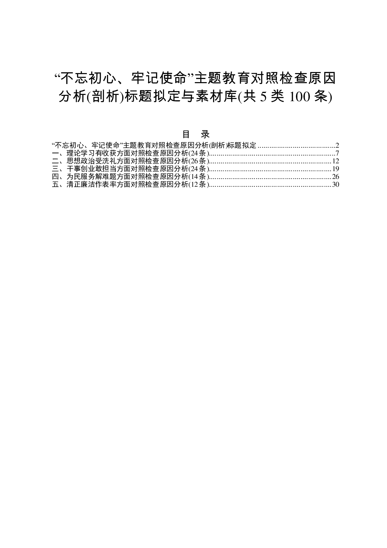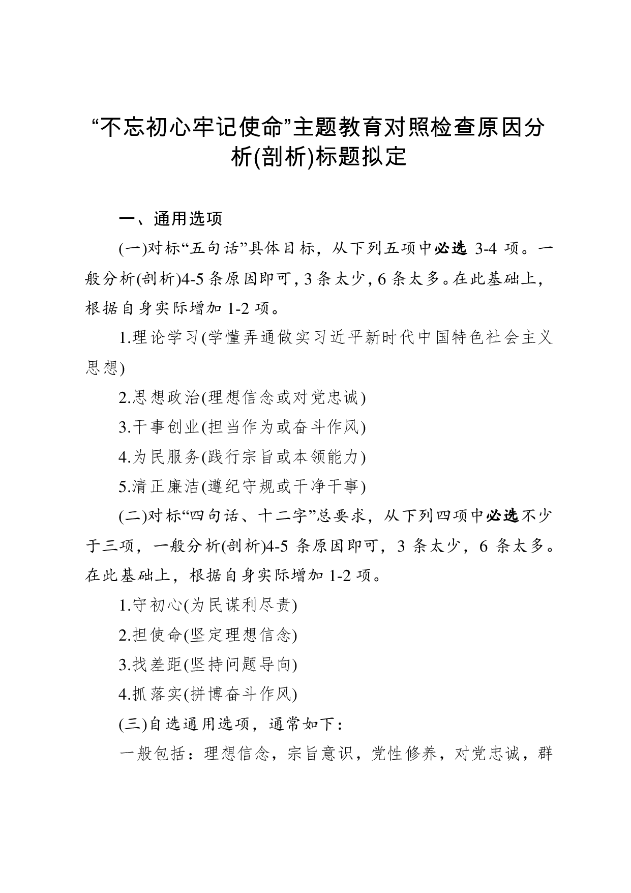 标题:不忘初心牢记使命主题教育对照检查原因分析剖析标题拟定与素材库共5类100条