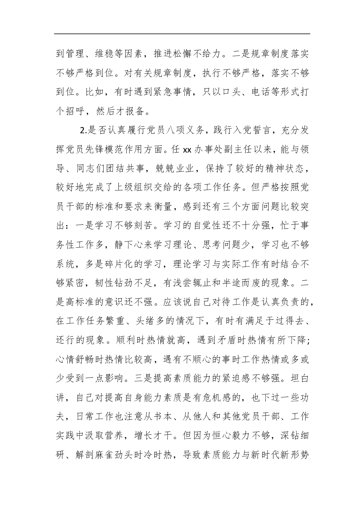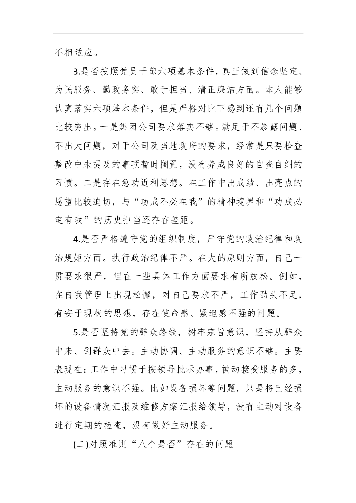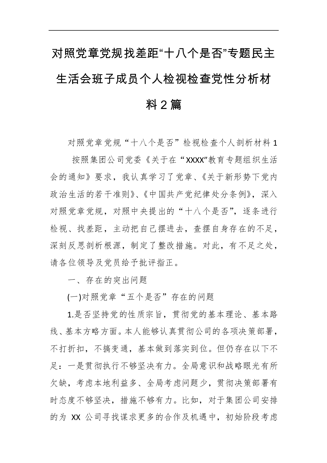 标题:对照党章党规找差距“十八个是否”专题民主生活会班子成员个人检视检查党性分析材料2篇