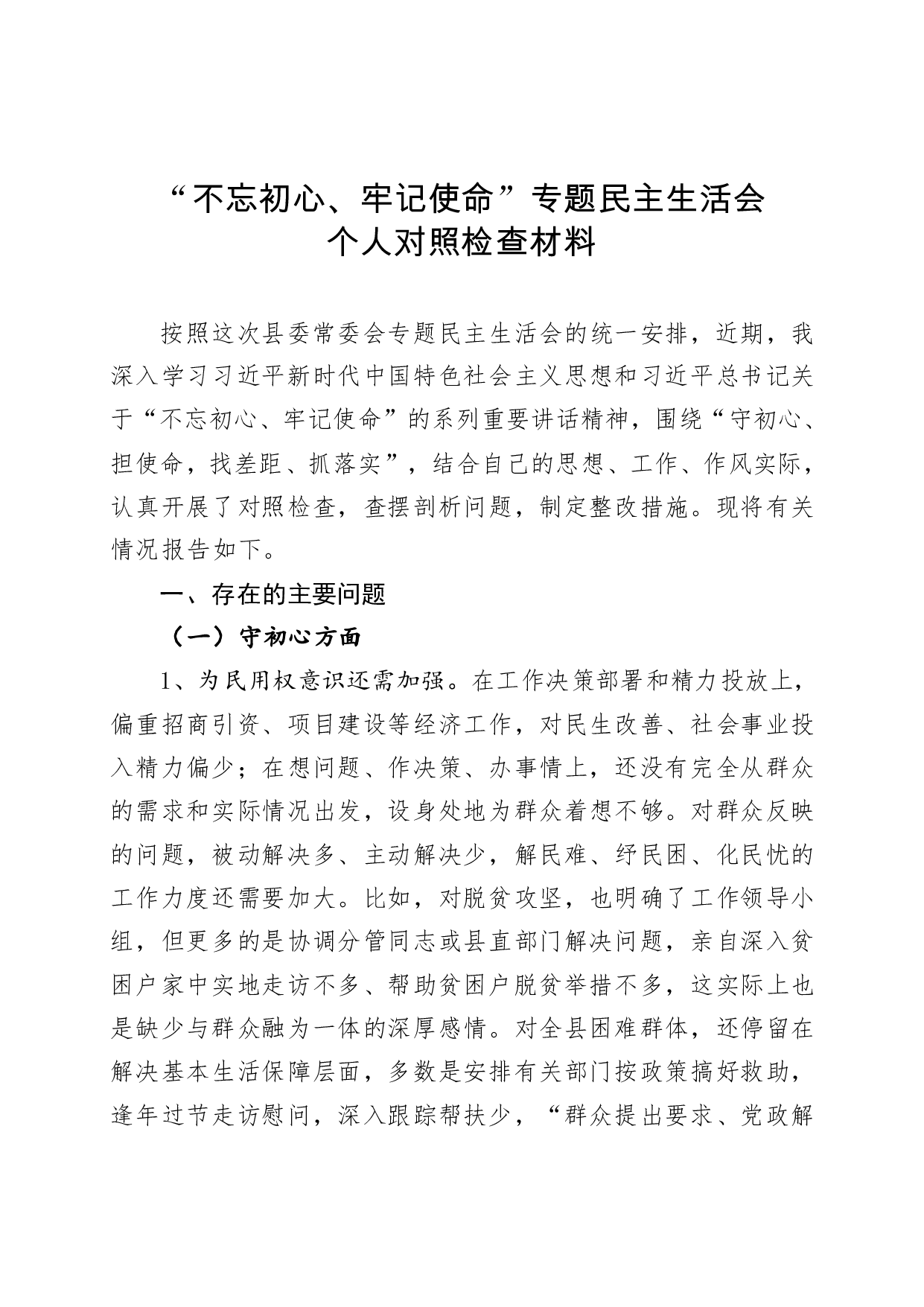 标题:不忘初心牢记使命对照检查材料