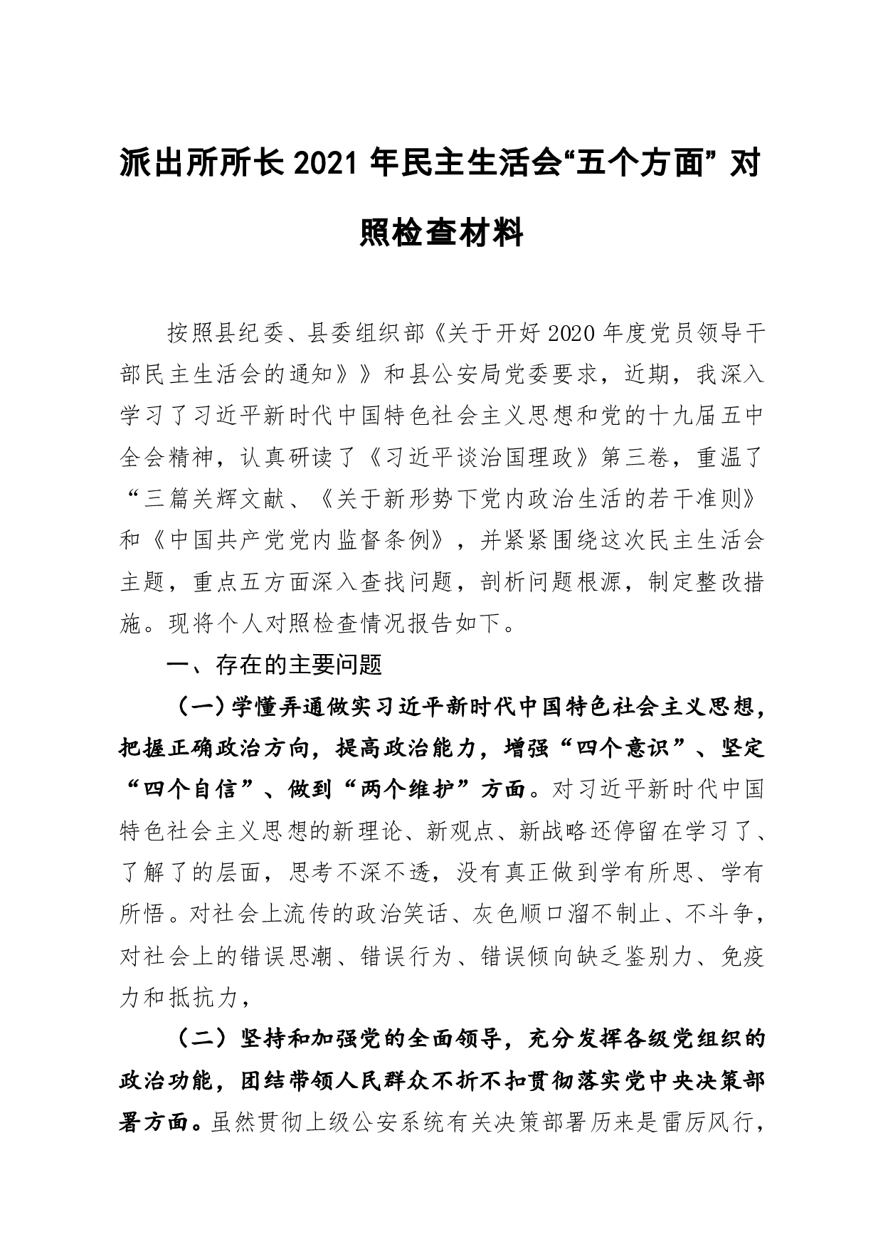 标题:派出所所长2021年民主生活会五个方面对照检查材料