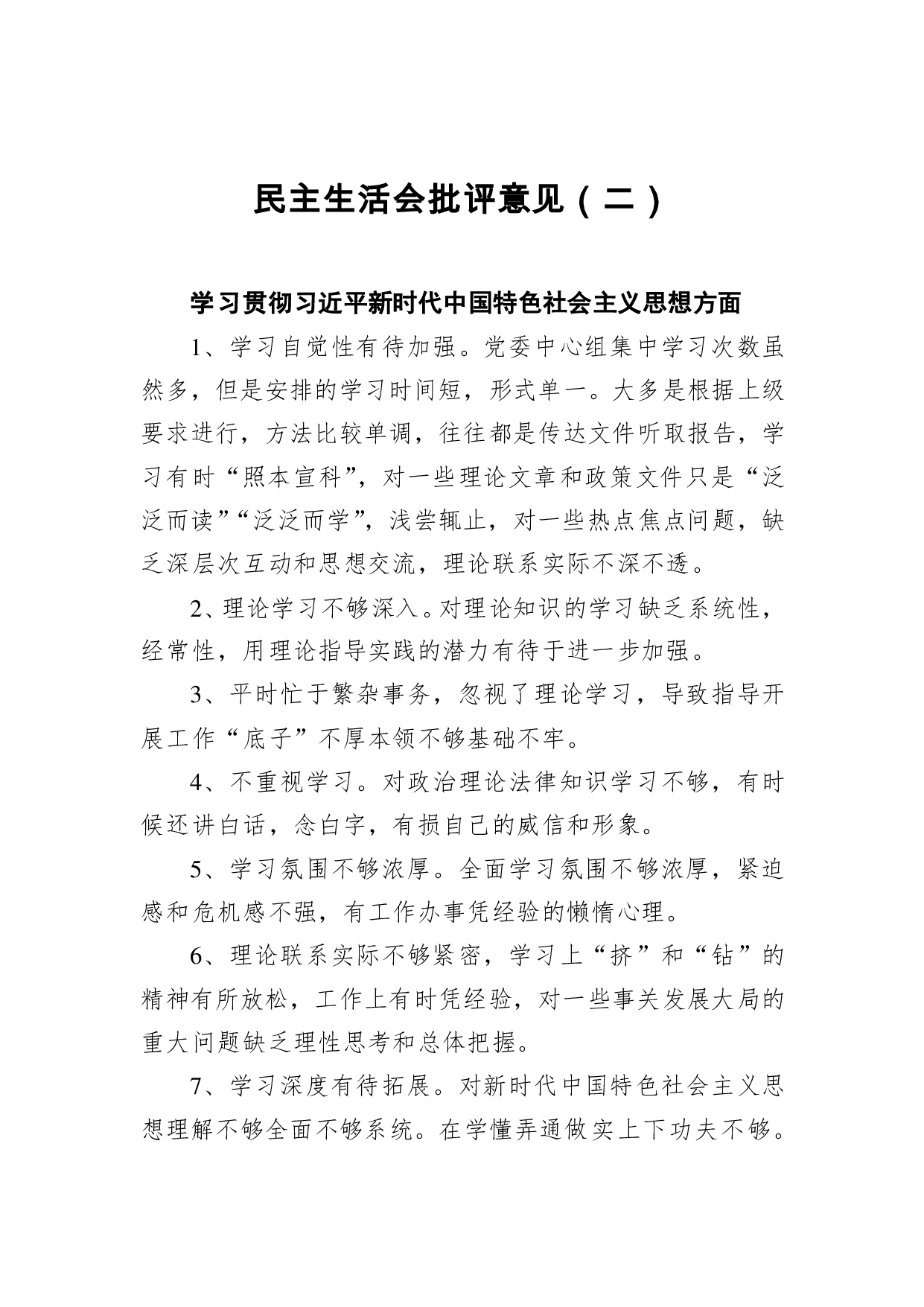 标题:民主生活会批评意见(二)