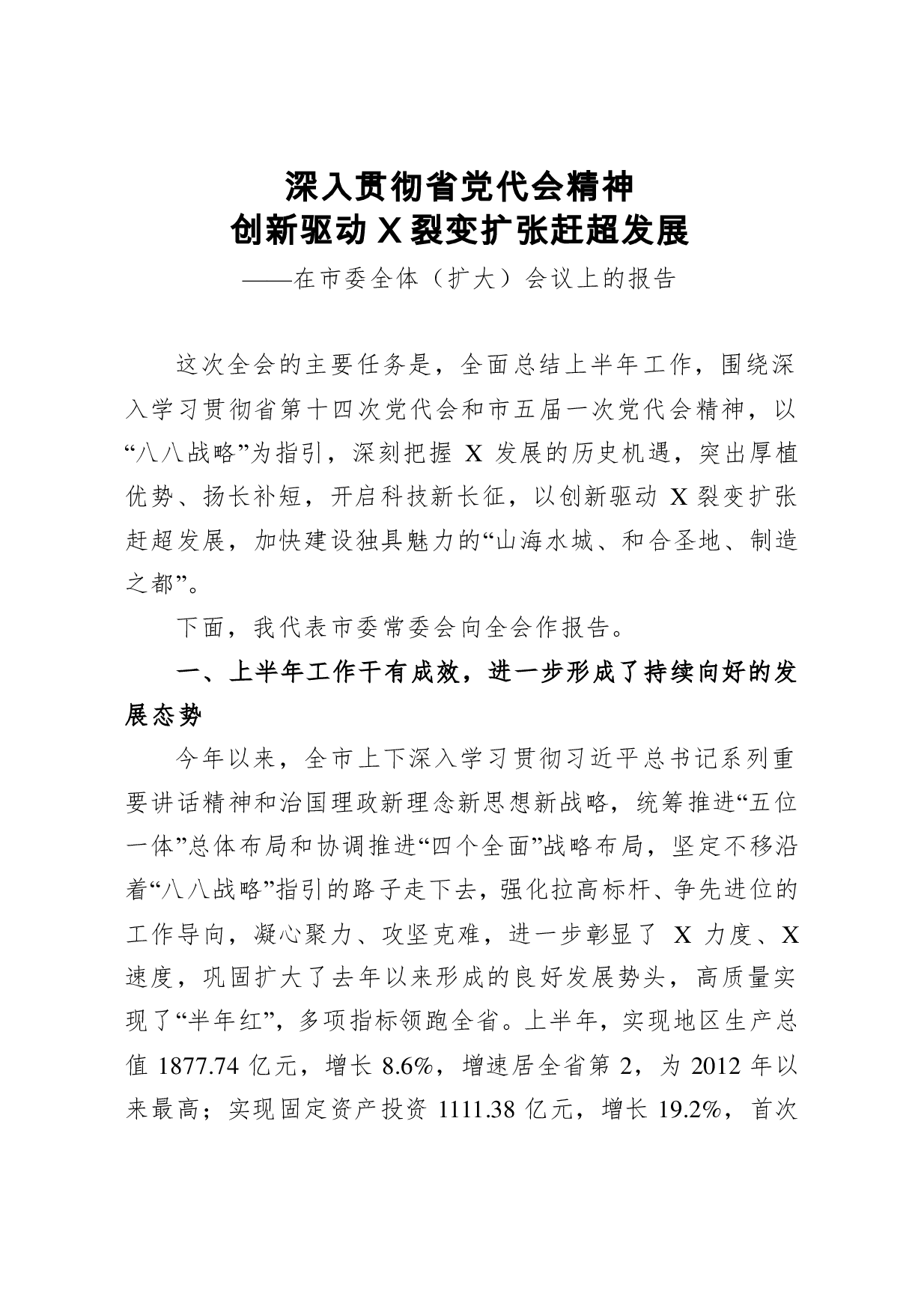 标题:深入贯彻省党代会精神创新驱动X裂变扩张赶超发展在市委全体扩大会议上的报告