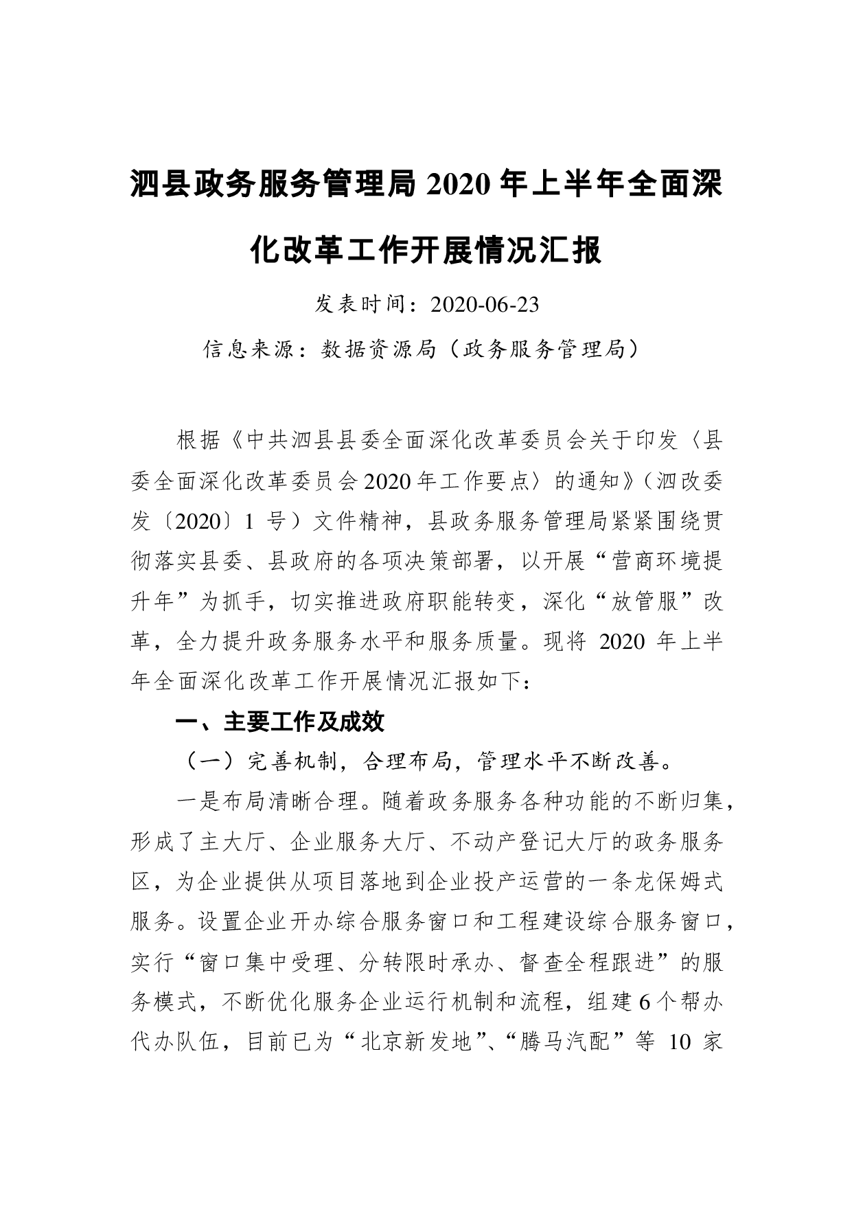 标题:泗县政务服务管理局2020年上半年全面深化改革工作开展情况汇报