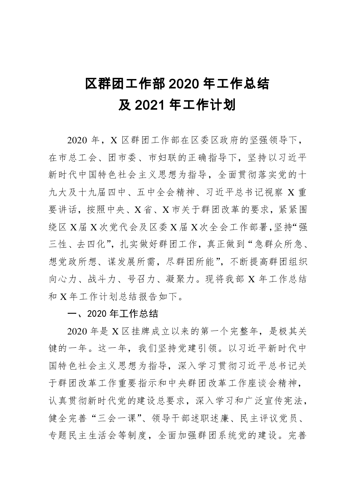 标题:区群团工作部2020年工作总结及2021年工作计划