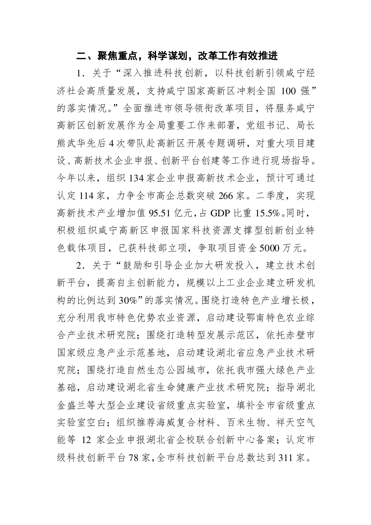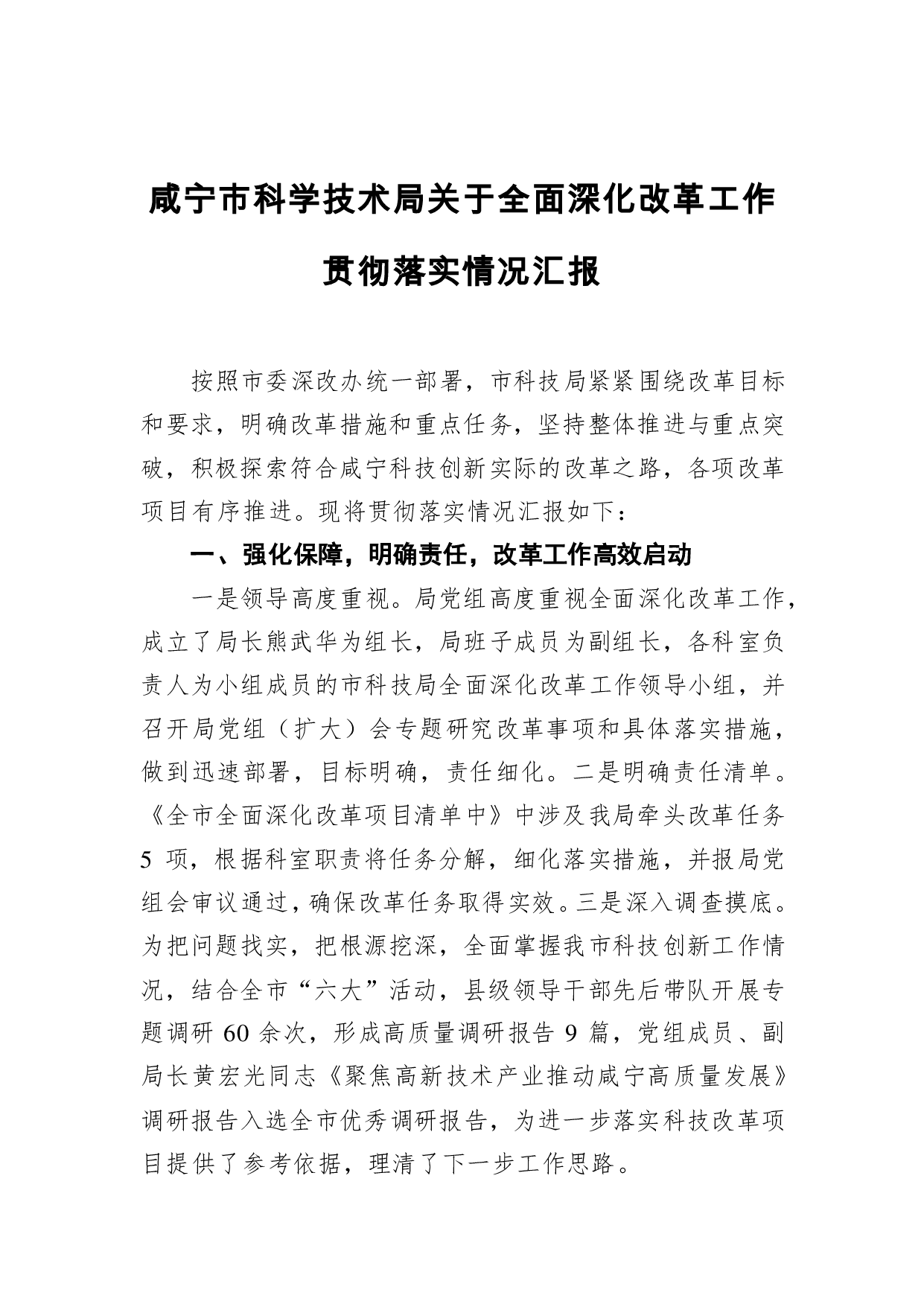 标题:咸宁市科学技术局关于全面深化改革工作贯彻落实情况汇报