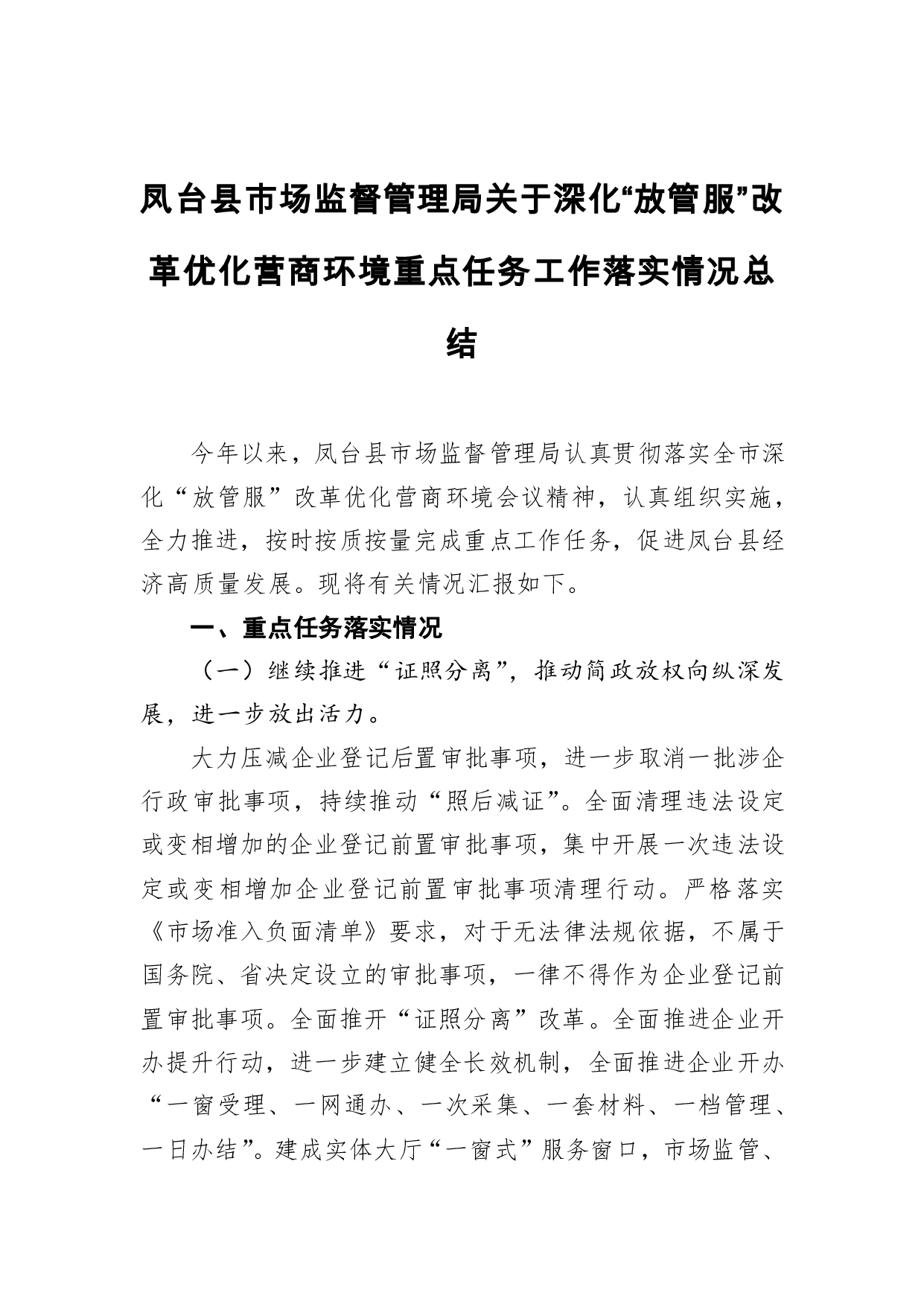 标题:凤台县市场监督管理局关于深化“放管服”改革优化营商环境重点任务工作落实情况总结