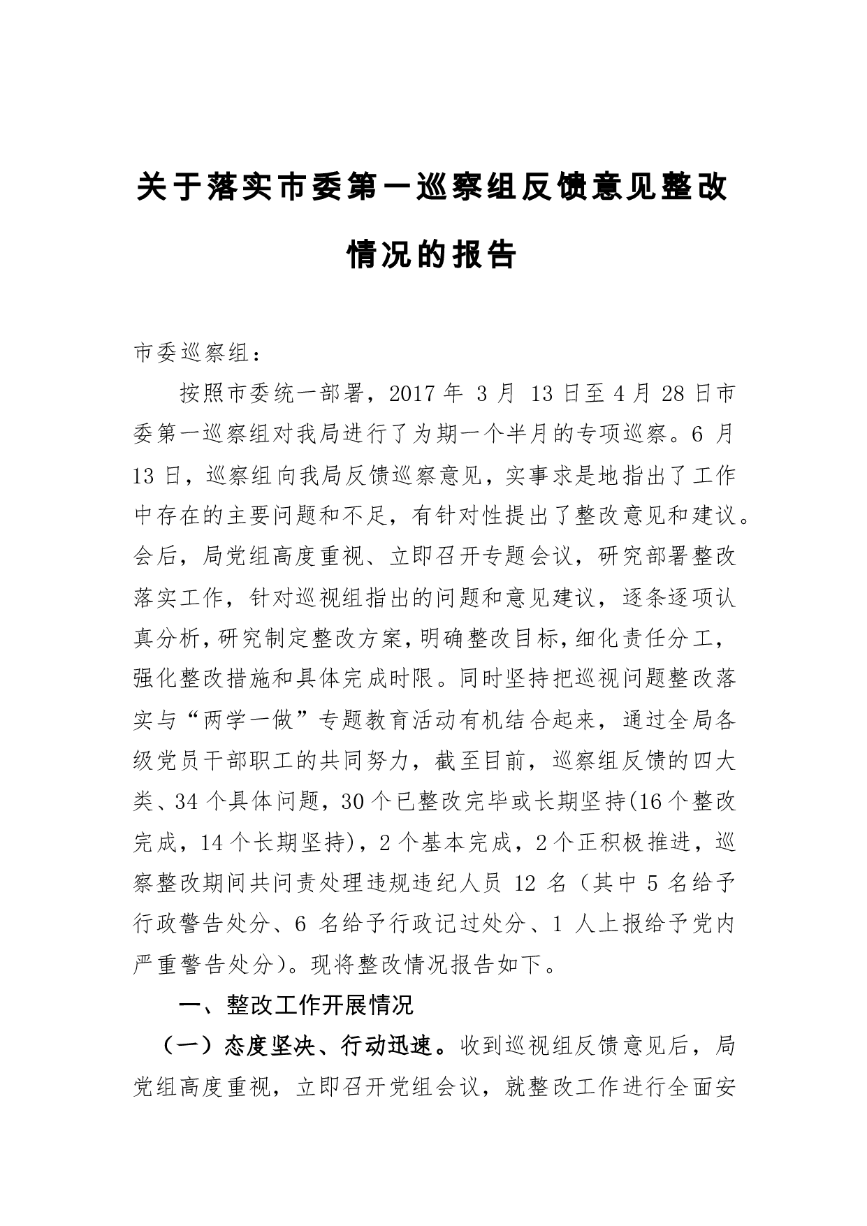标题:关于落实市委第一巡察组反馈意见整改情况的报告_转换