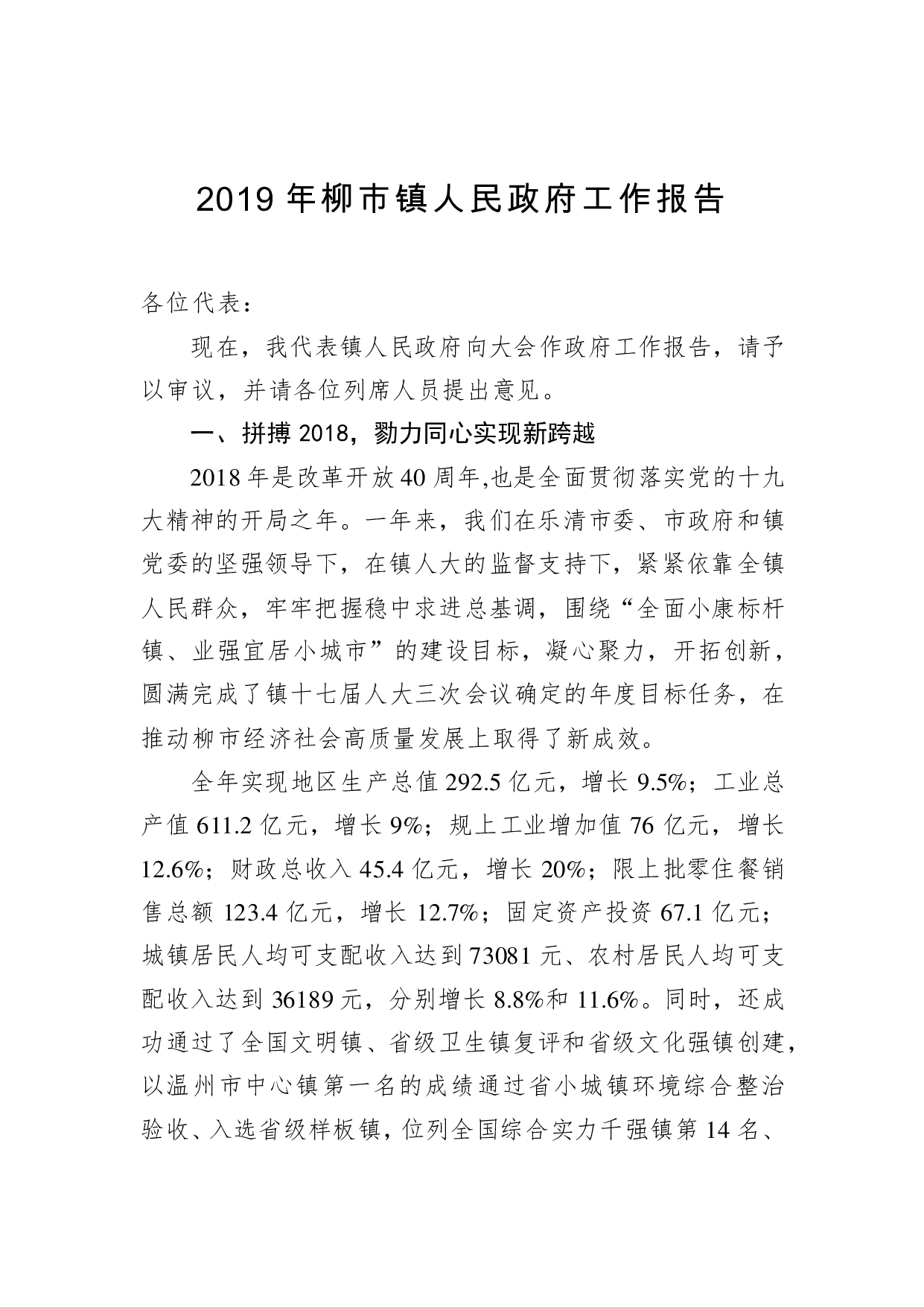 标题:2019年柳市镇人民政府工作报告