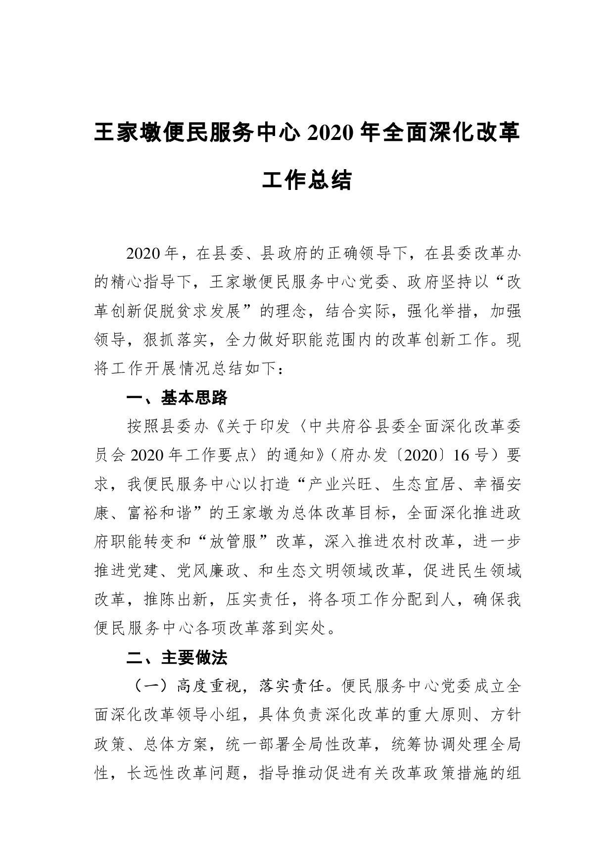 标题:王家墩便民服务中心2020年全面深化改革工作总结