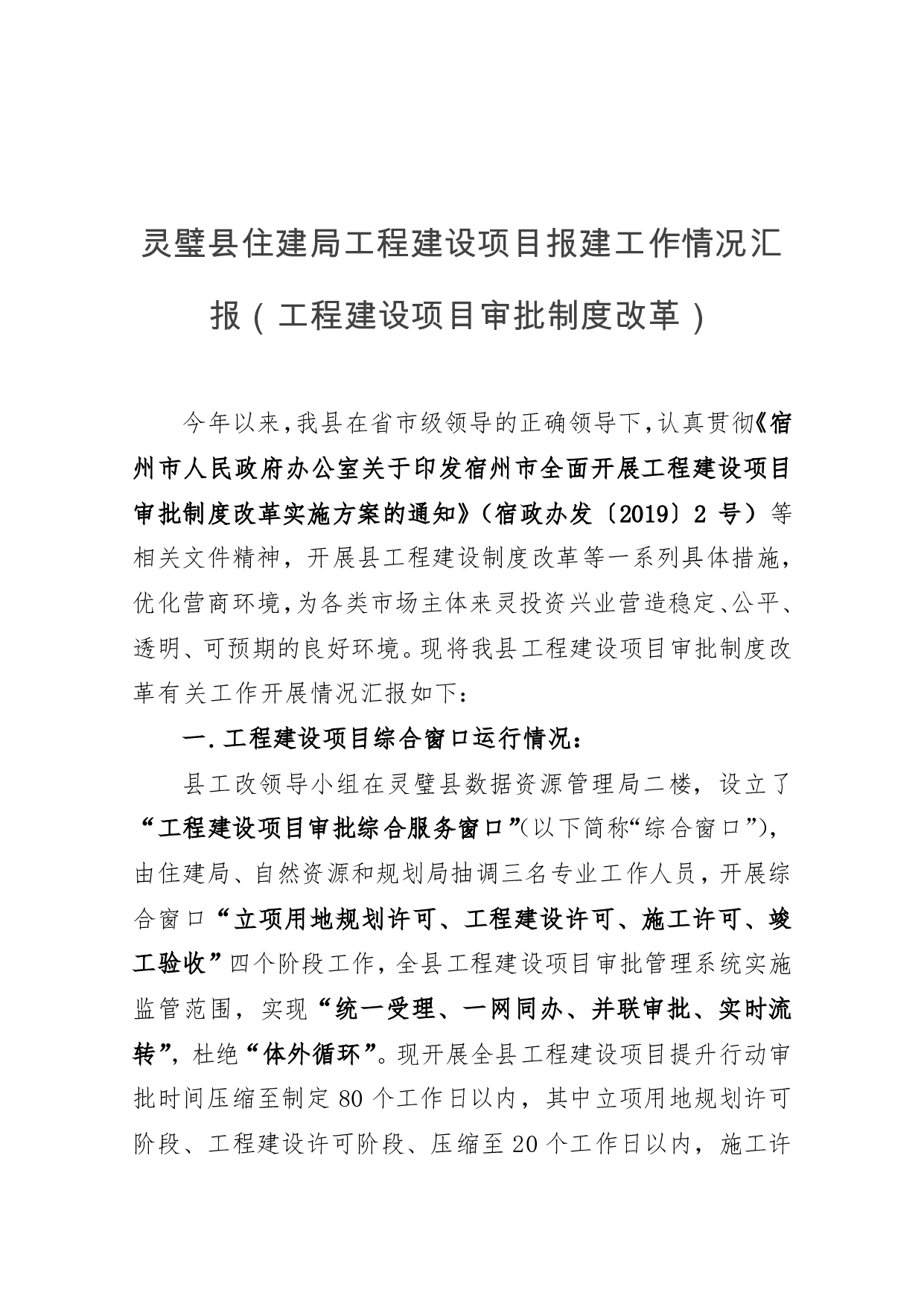 标题:灵璧县住建局工程建设项目报建工作情况汇报(工程建设项目审批制度改革)