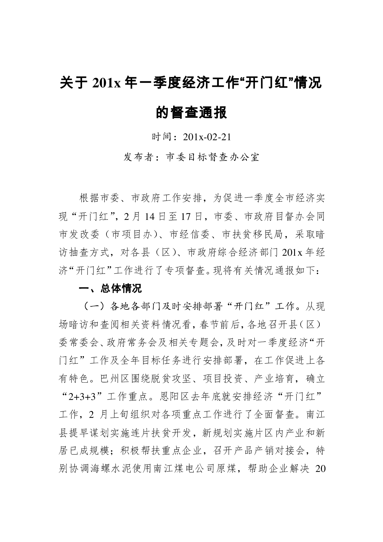 标题:关于201x年一季度经济工作“开门红”情况的督查通报