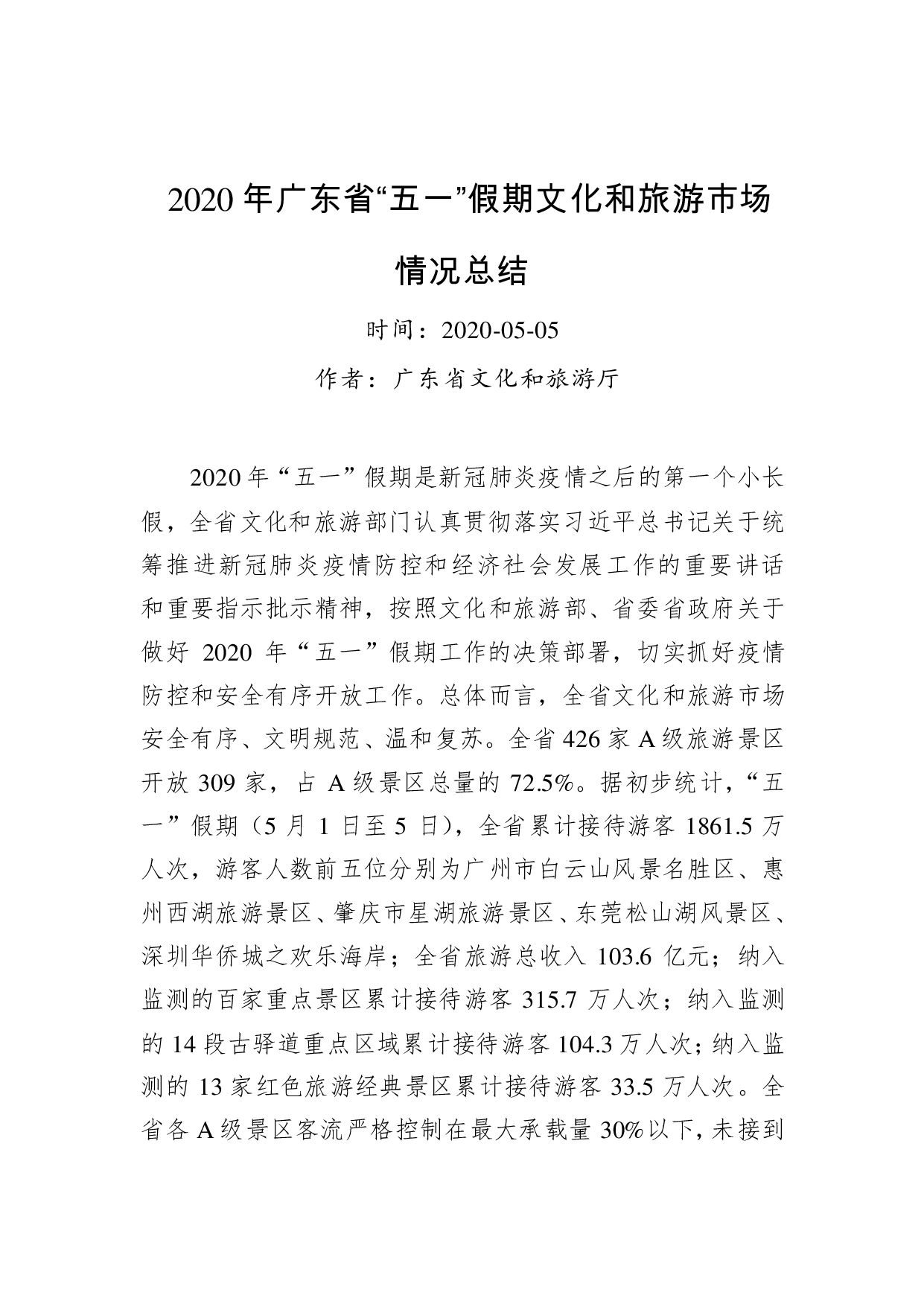 标题:2020年广东省“五一”假期文化和旅游市场情况总结
