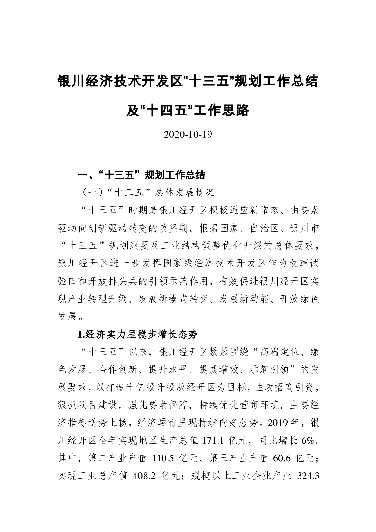 标题:银川经济技术开发区“十三五”规划工作总结及“十四五”工作思路