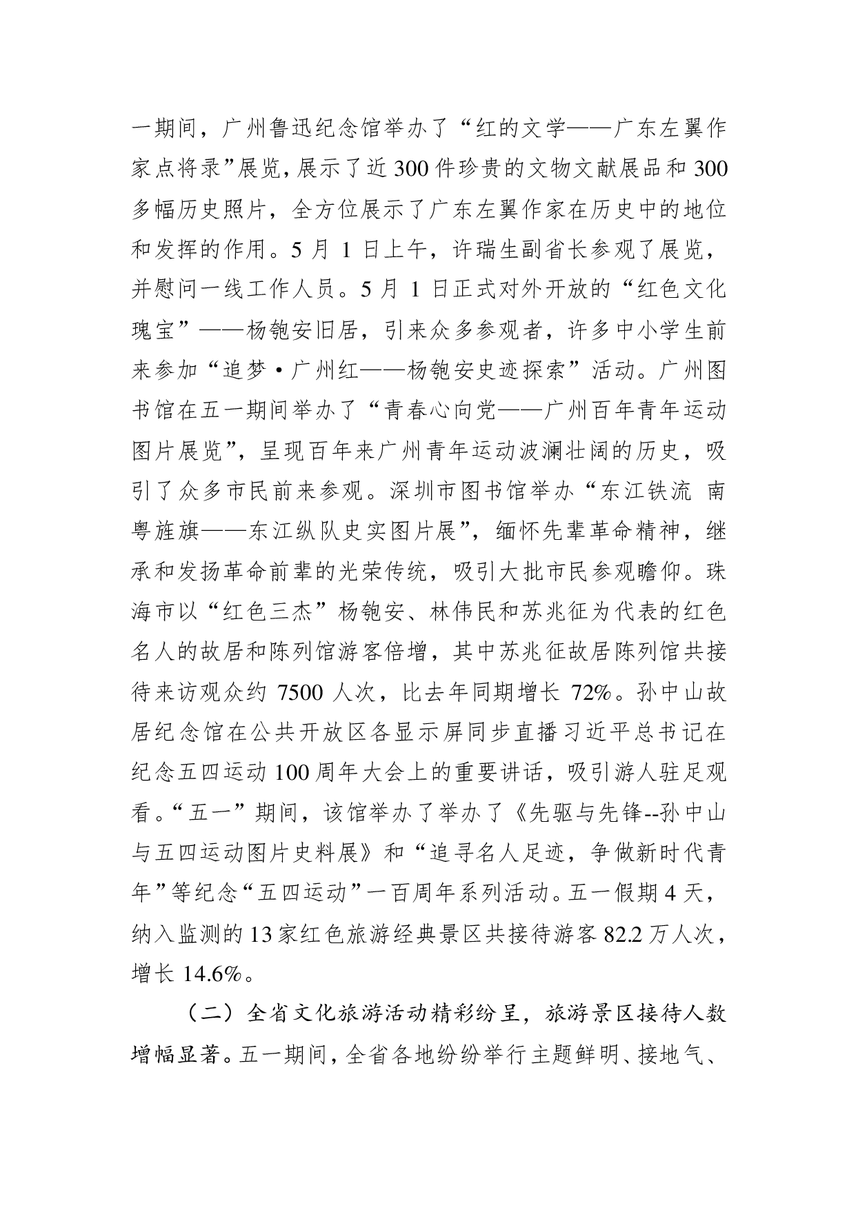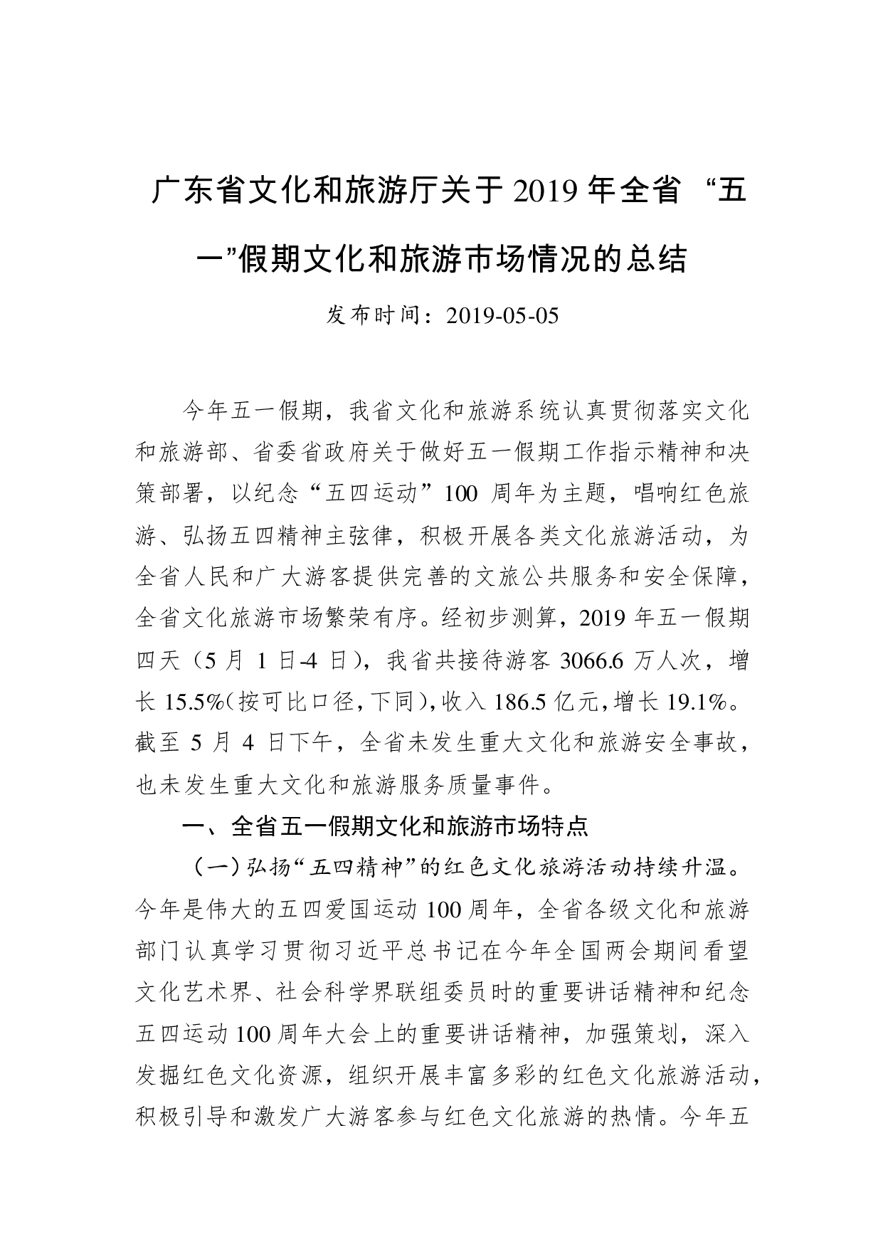 标题:广东省文化和旅游厅关于2019年全省 “五一”假期文化和旅游市场情况的总结