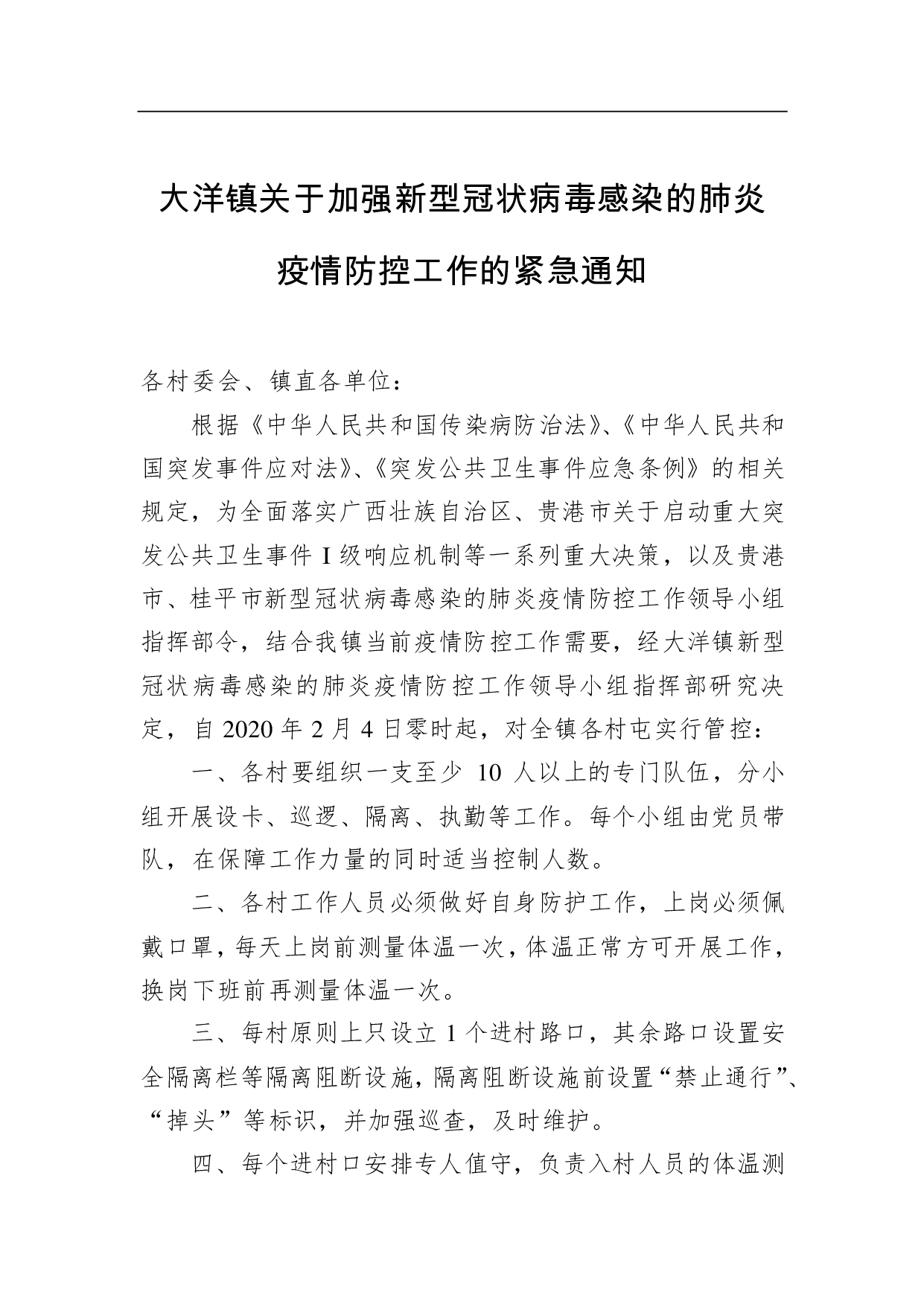标题:大洋镇关于加强新型冠状病毒感染的肺炎疫情防控工作的紧急通知_转换