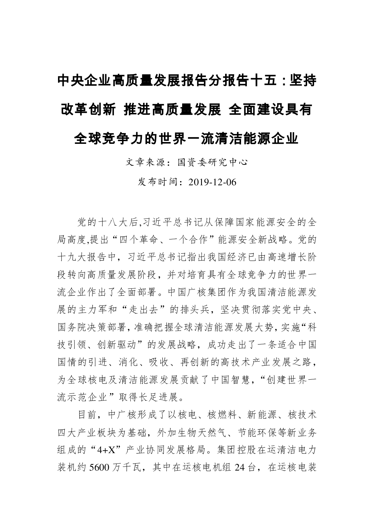 标题:中央企业高质量发展报告分报告十五:坚持改革创新 推进高质量发展 全面建设具有全球竞争力