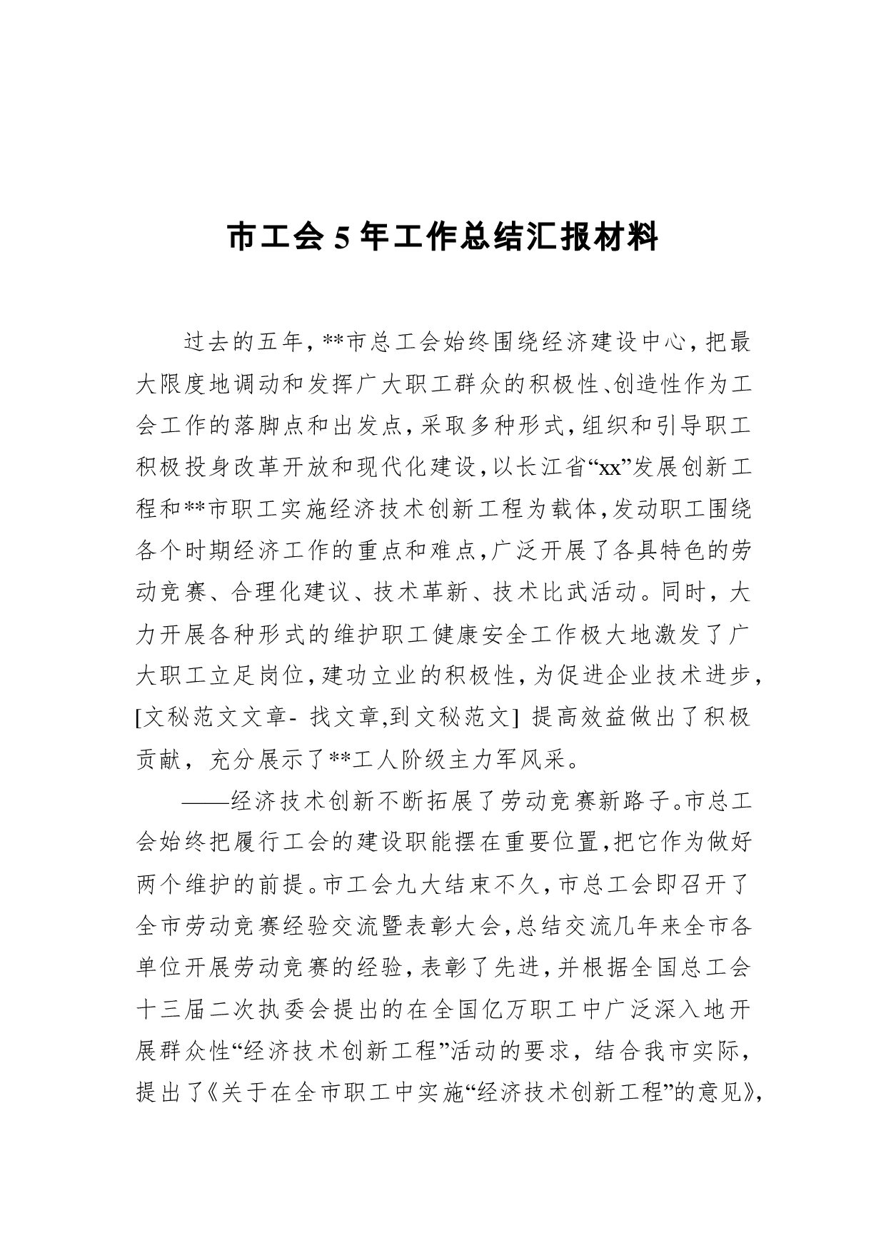 标题:市工会5年工作总结汇报材料
