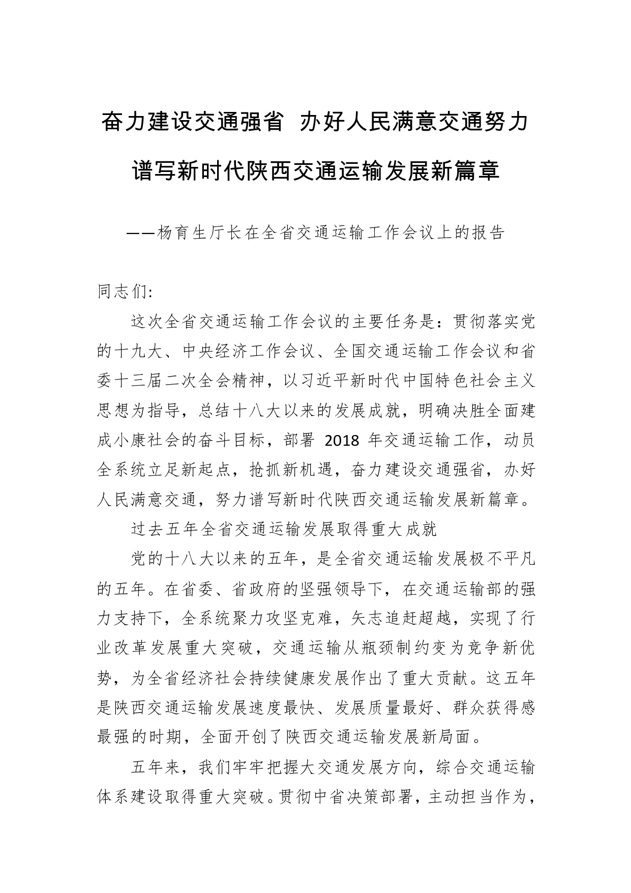 标题:杨育生厅长:在2018年全省交通运输工作会议上的报告